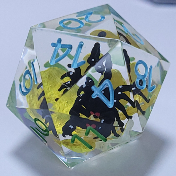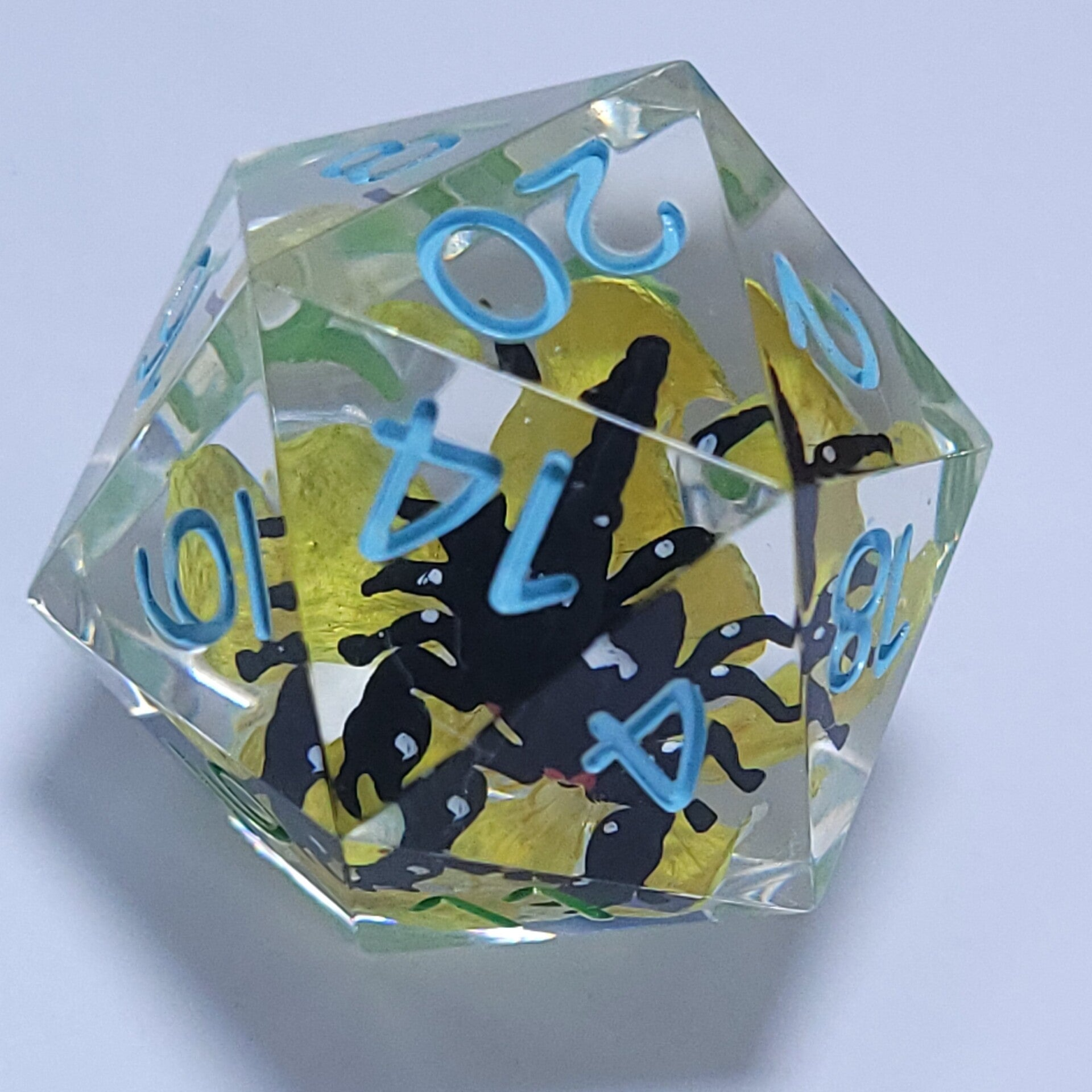 A hand painted Scorpion sits on a buttercup in the center of this 25mm D20. Inked in sky blue on the top and grass green on the base.