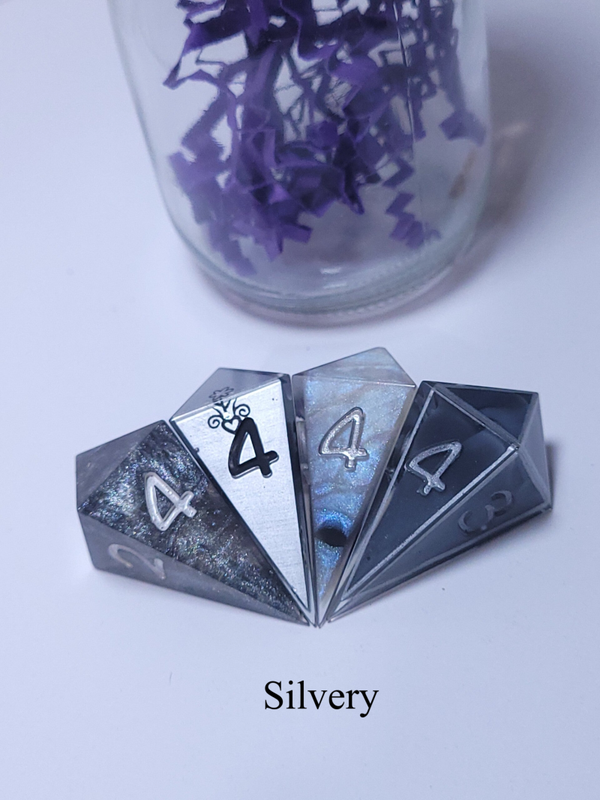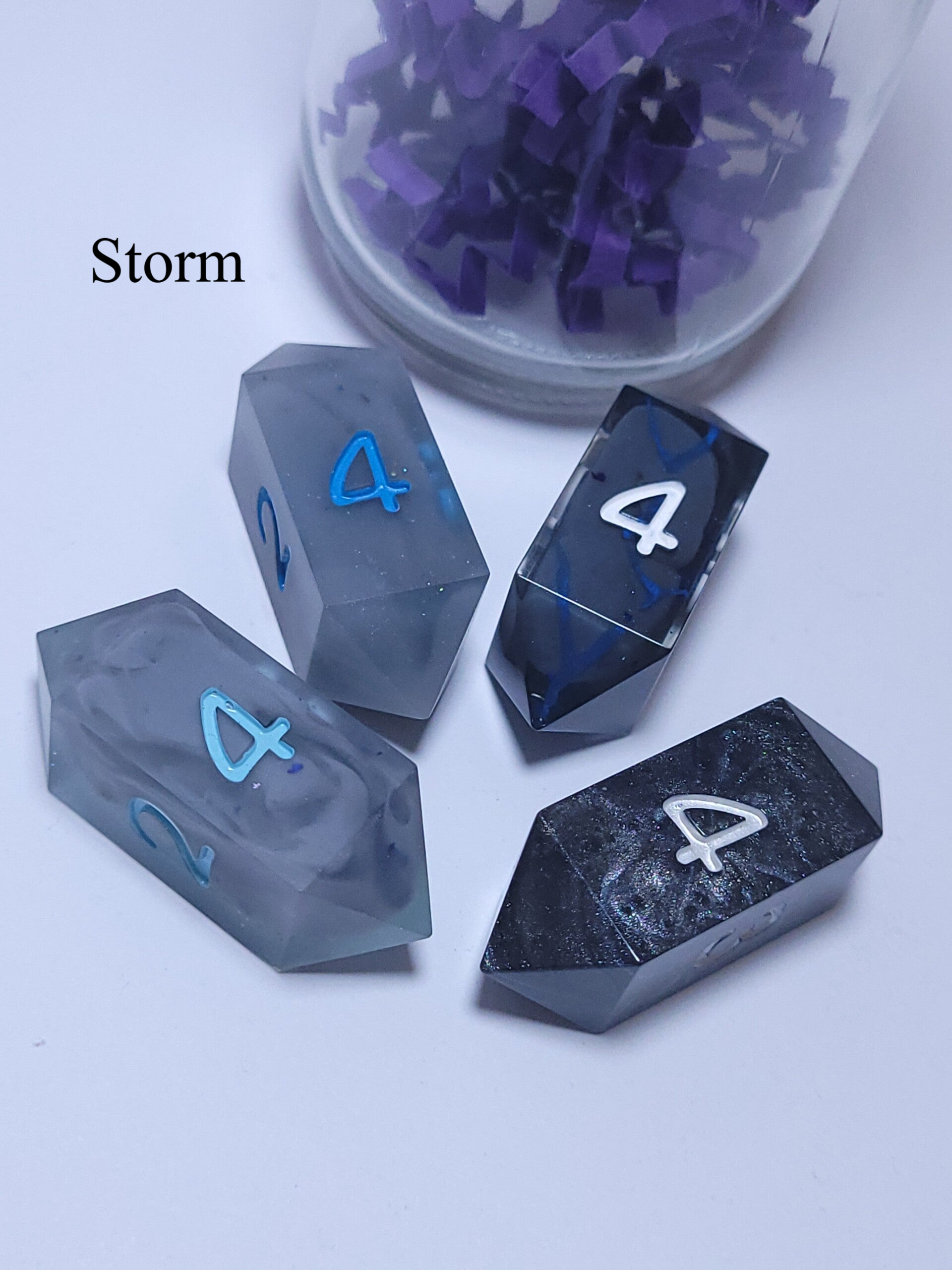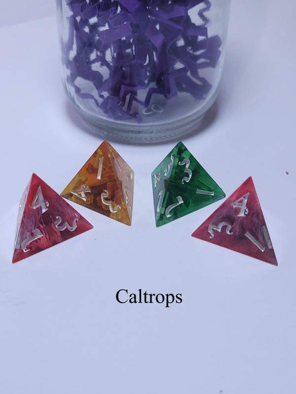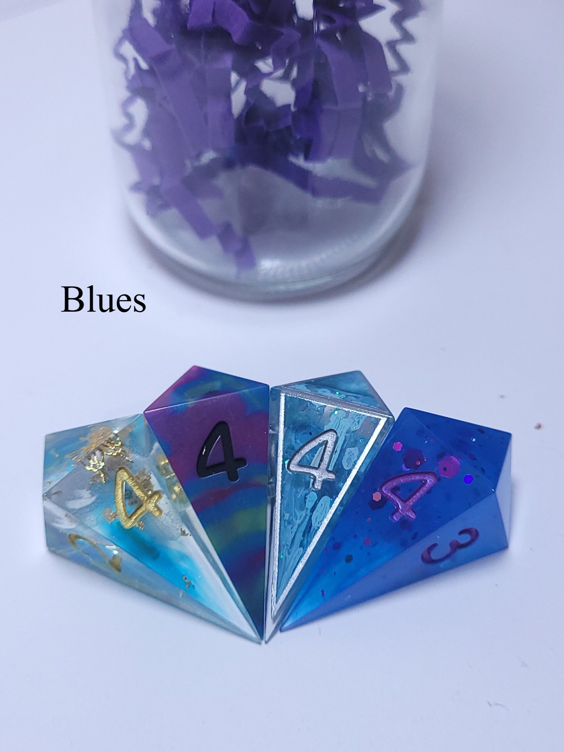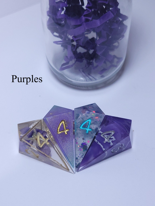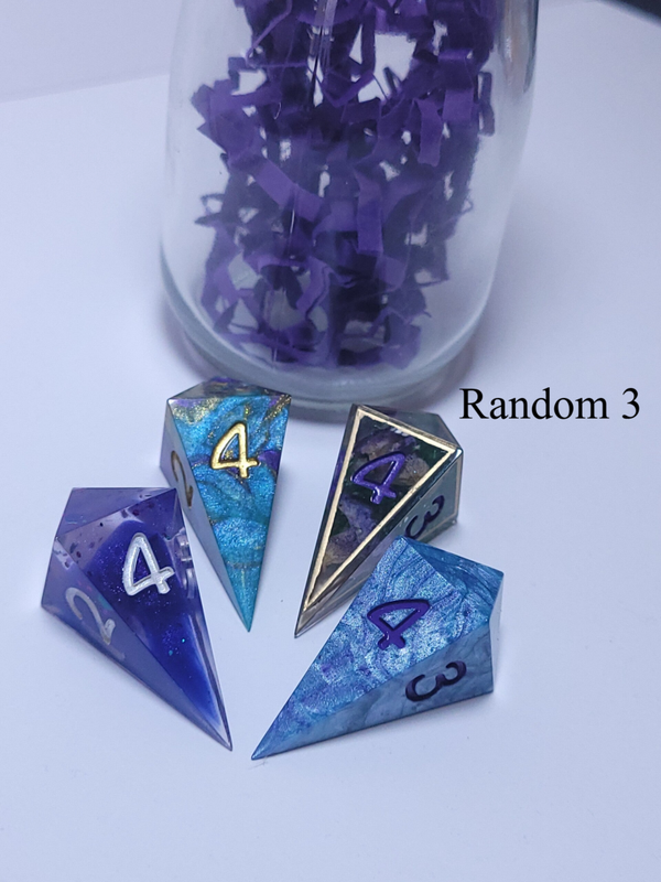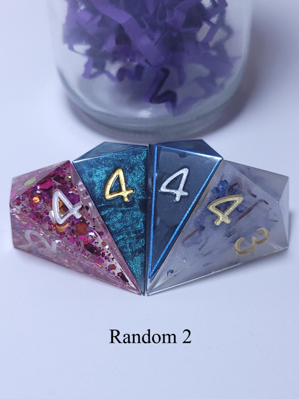 4 Random D4s in a glass bottle. Use for a health potion or just fun dice of diferent designs. Pick the set you want!