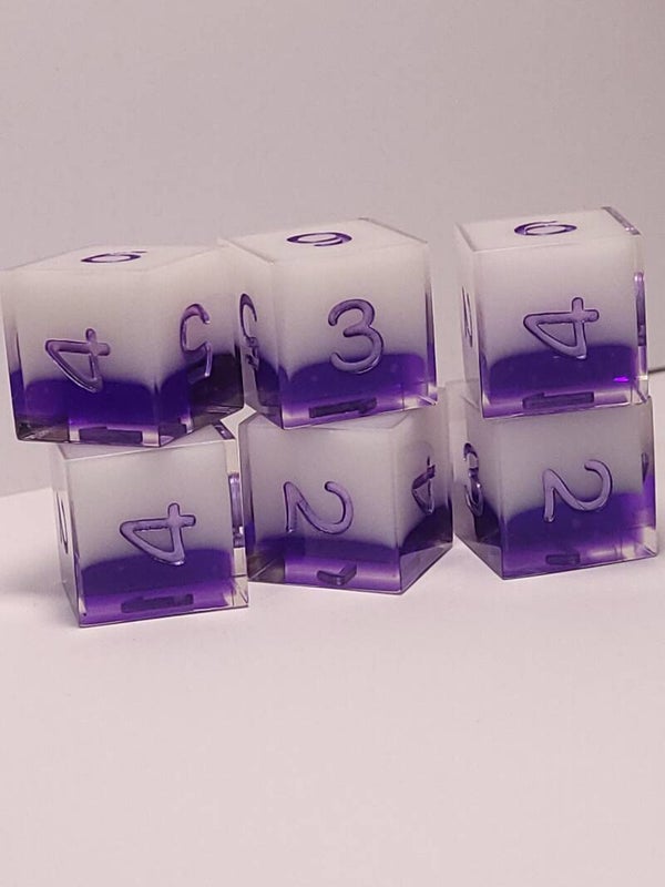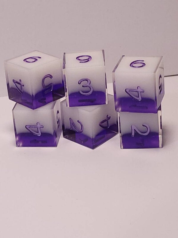This is a layered white and purple D6 set. The white has a blue interference powder so it has a blue sparkle.