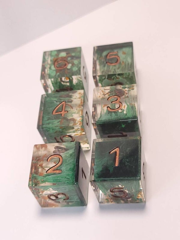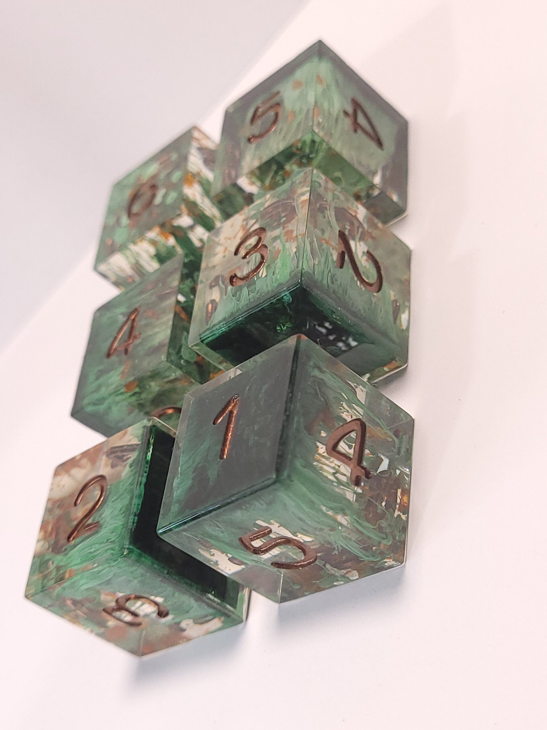 This set is a green petri. The base has orange lilly petal shreds and a green interference powder.