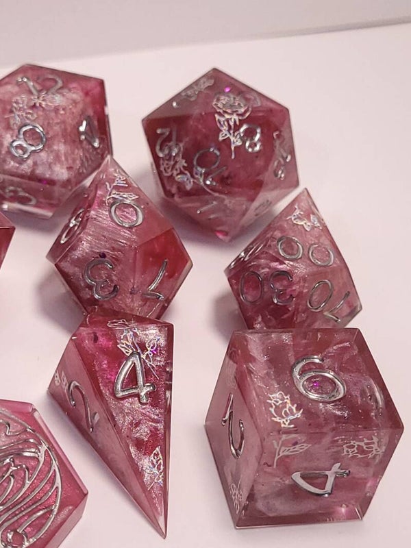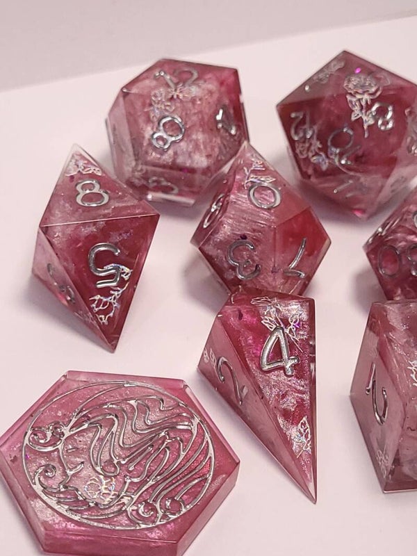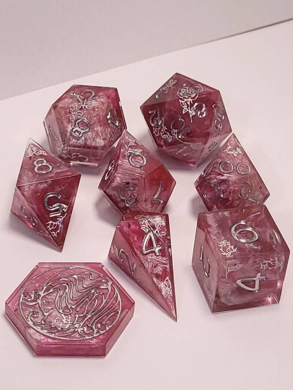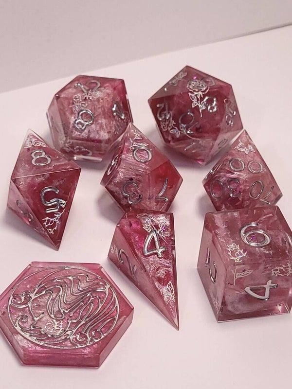 This set is a swirl of dark and light pinks with chrome rose stickers and inked in chrome.