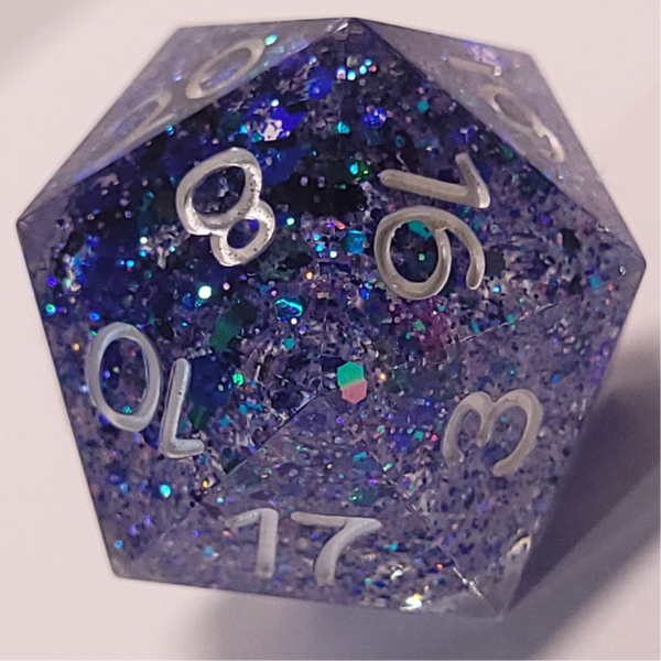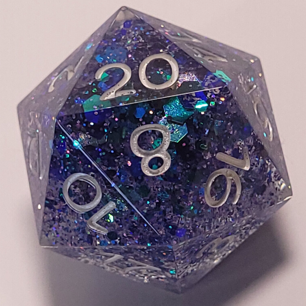 These 2 dice are a combo of a lavender holo glitter and a blue green shift glitter. Inked in white.