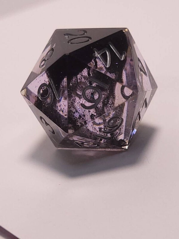 This d20 is a pale purple with a black fall of pigment through the middle.