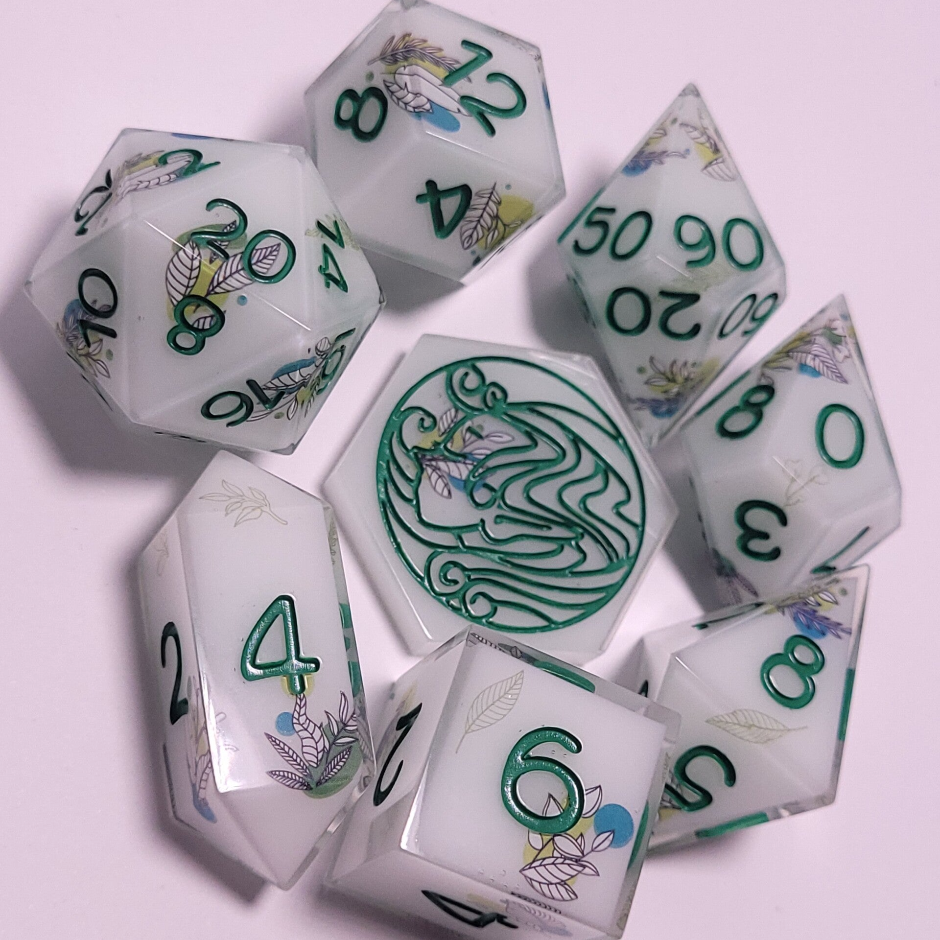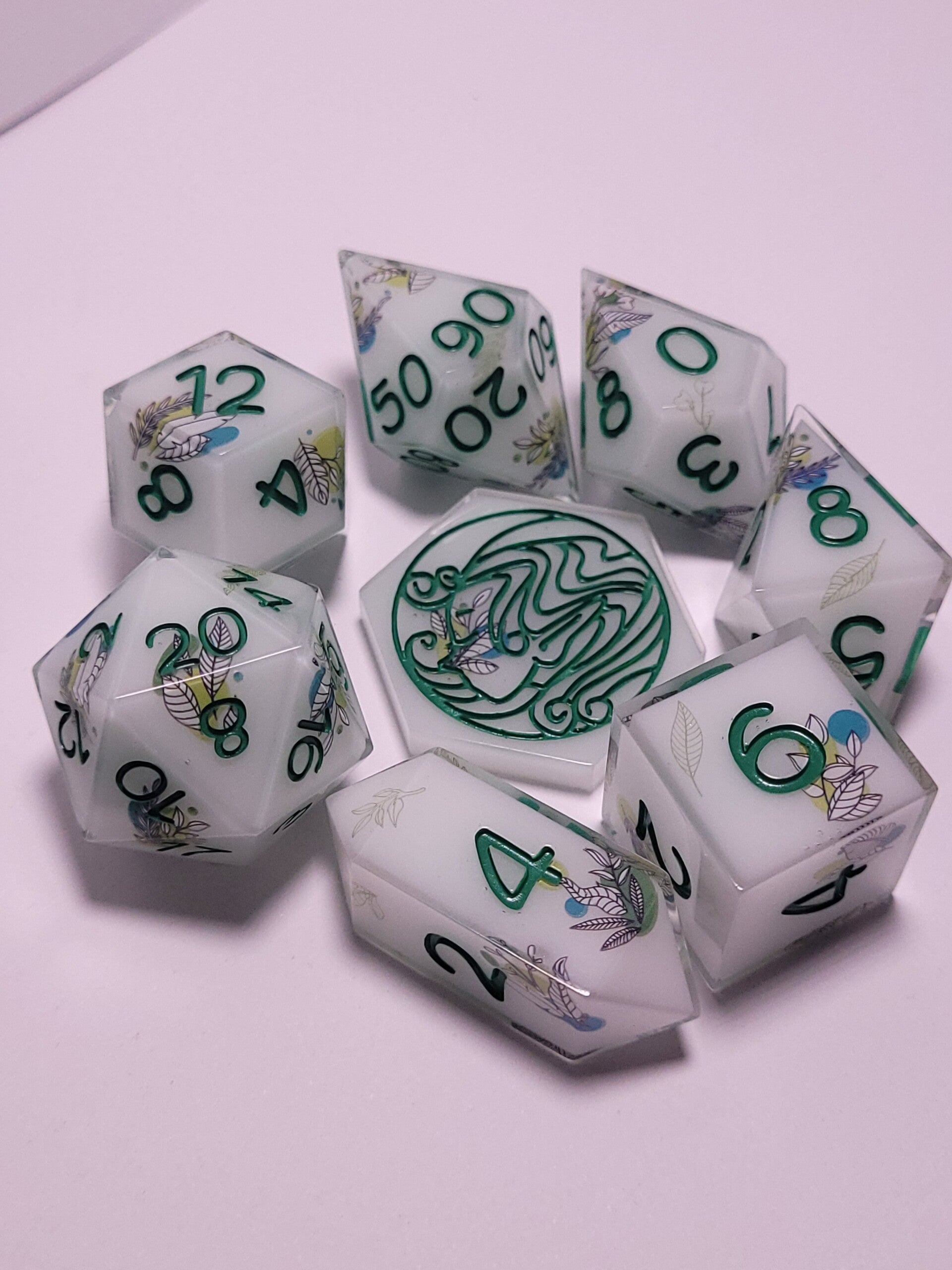This set is white based blanks with stickers of greens and foliage in a clear shell. Inked in a shade of green.