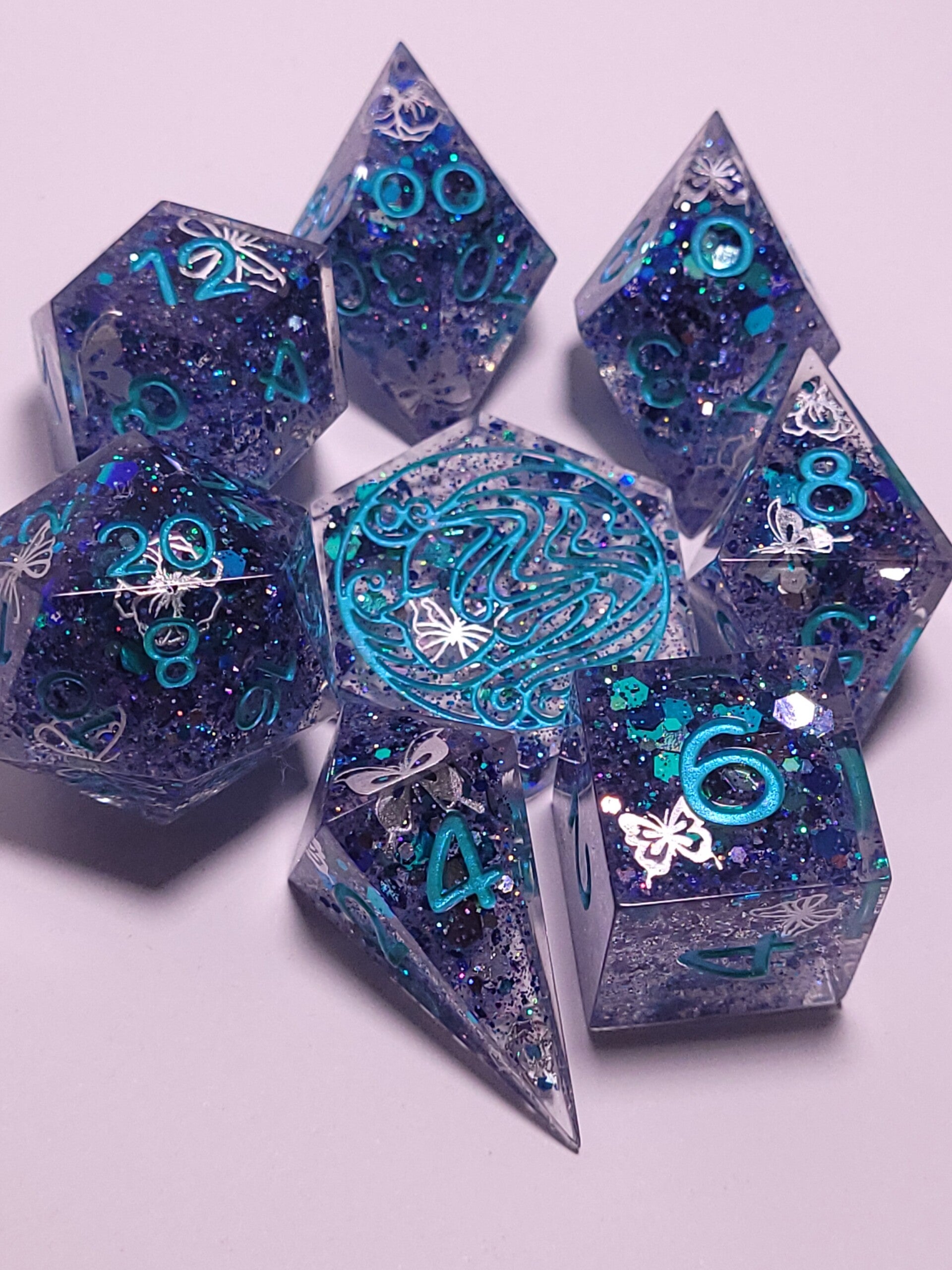 This set is a color shifting teal and purple glitter. With silver holo butterflies and flowers. Inked in a color shifting teal/blue.