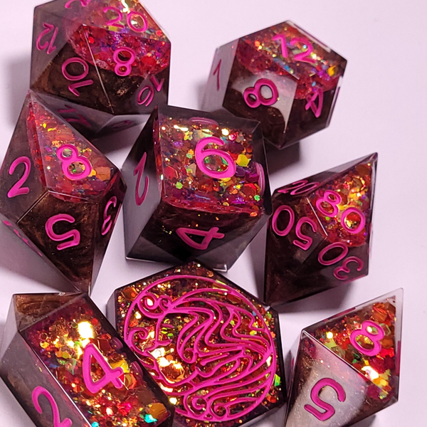 This is a set of blanks partialy filled with a dirty pour of golds and browns with some pink and orange thrown in with a red/gold/orange/pink color shifting gliters in the void space. Inked in hot pink.