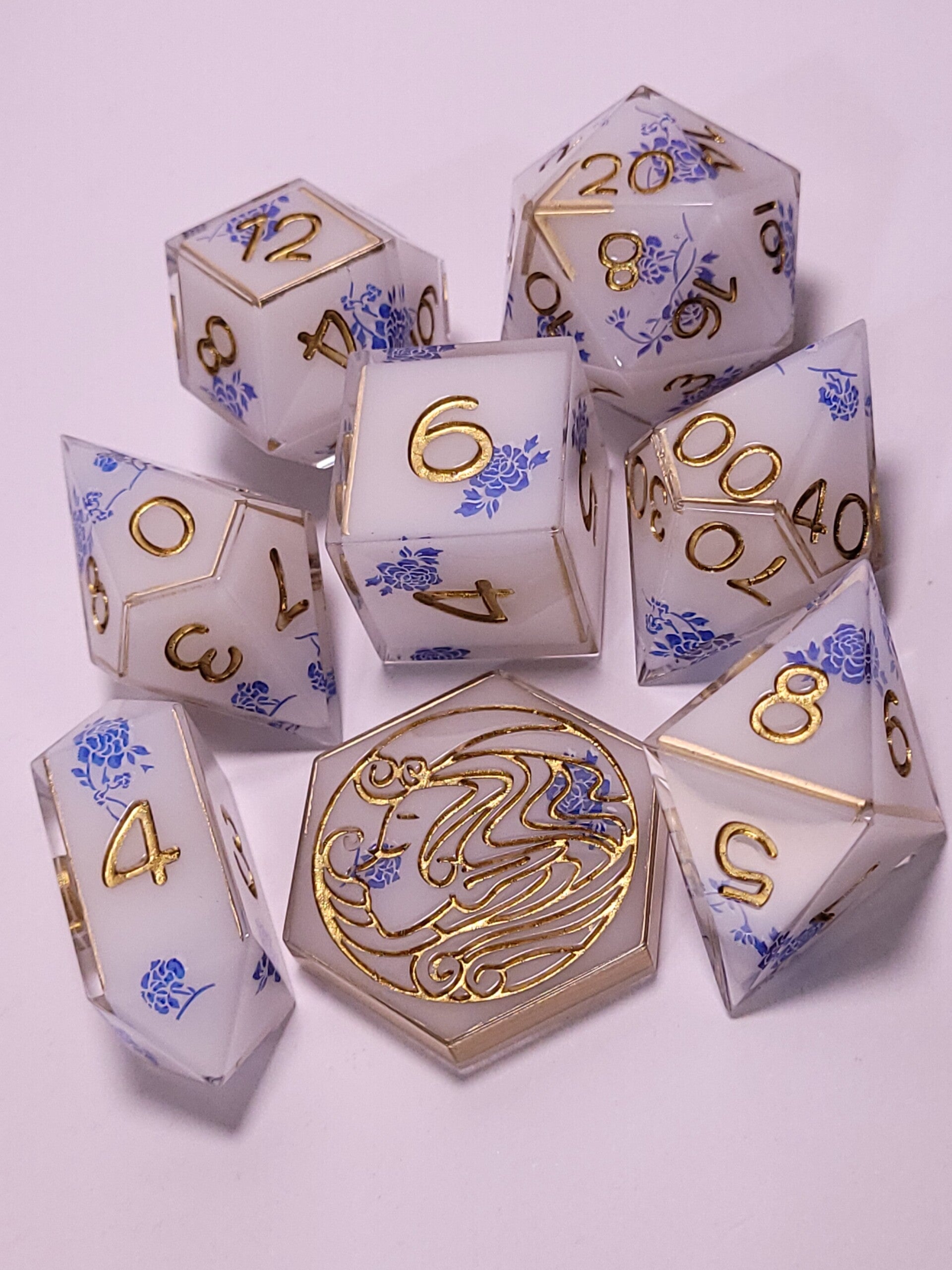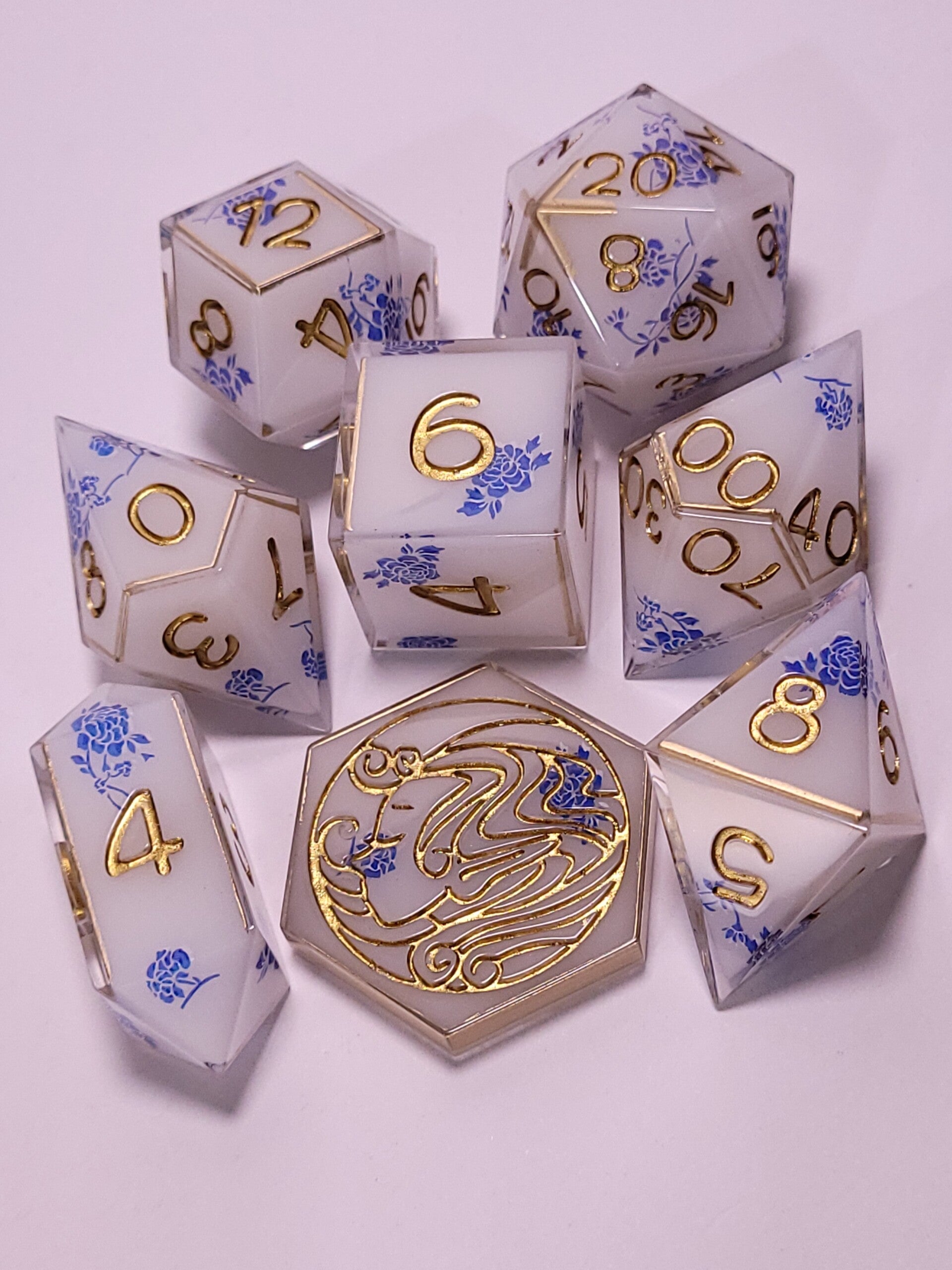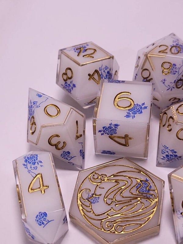 This is a white set with blue florals with strategic gold accents. Inked in gold.