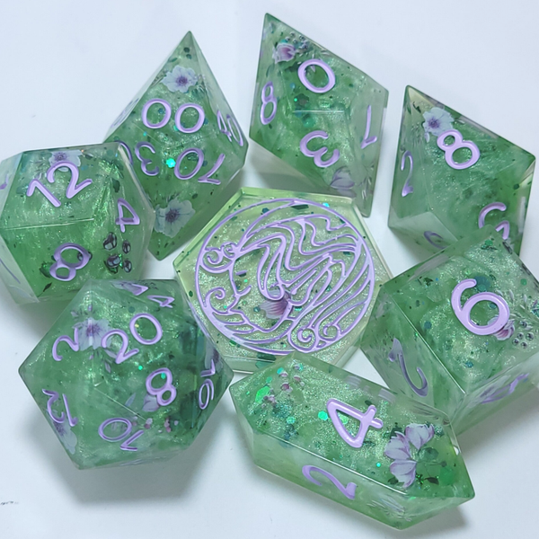This set is a swirling green with lavender floral stickers. Inked in a pale lavender.