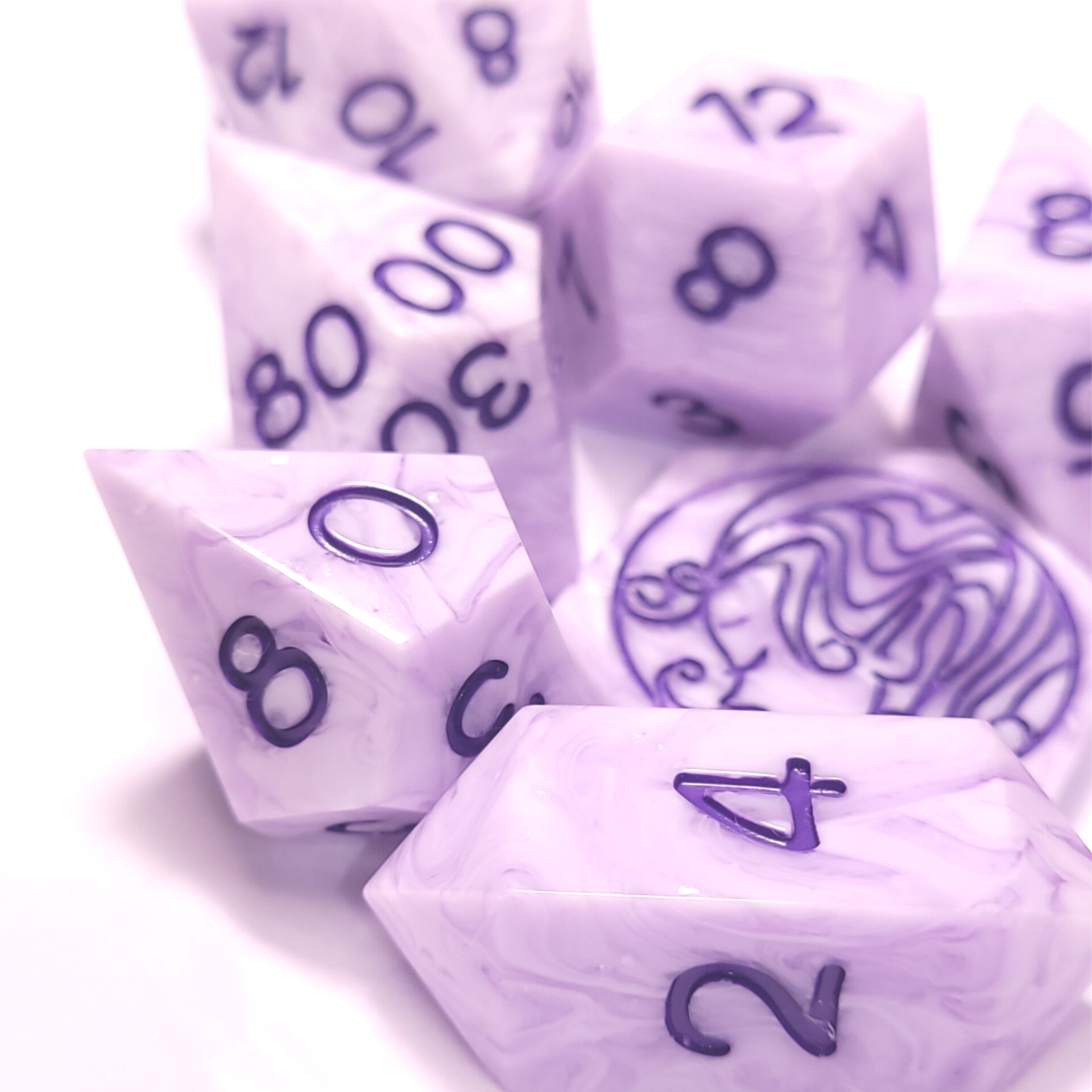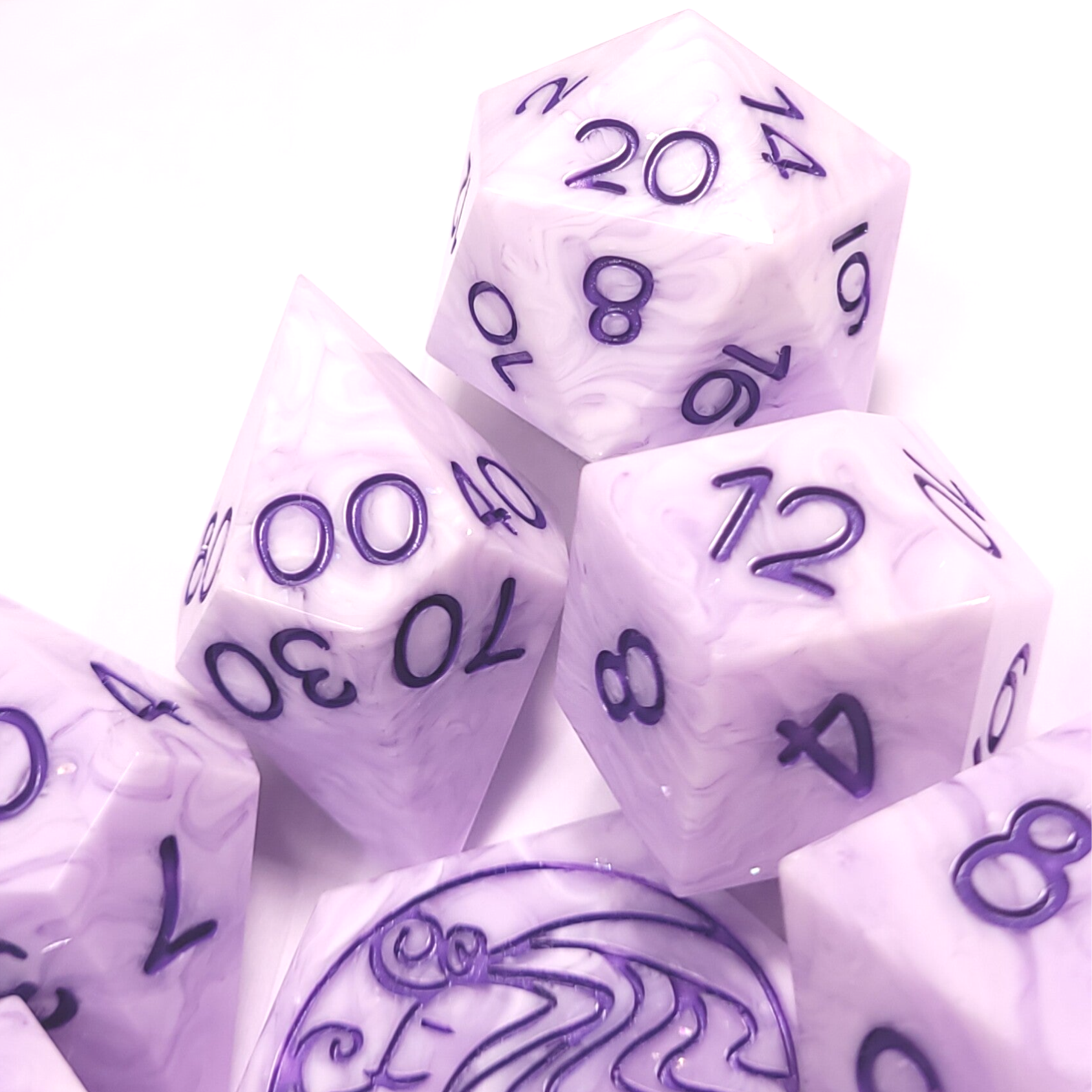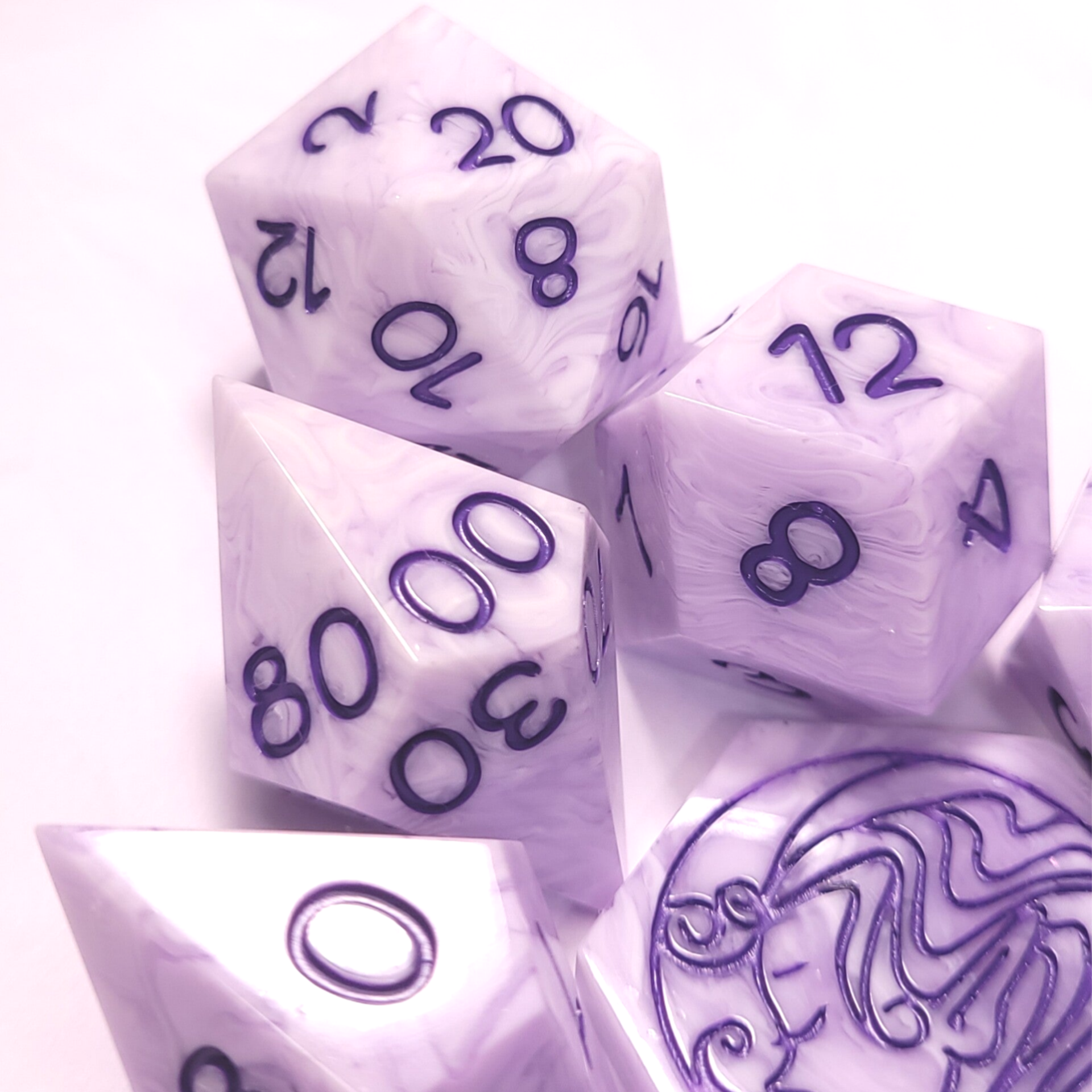 This set is a very fine thin marbling of white an shades of purple with an irridescent flake. Inked in a deep violet.