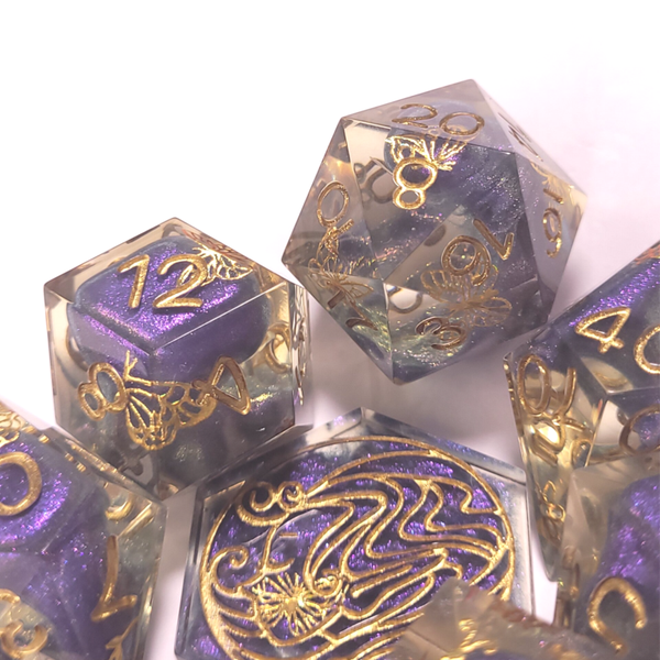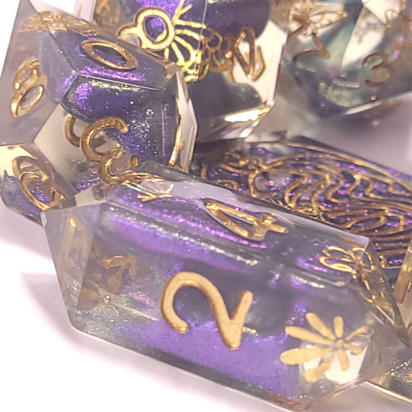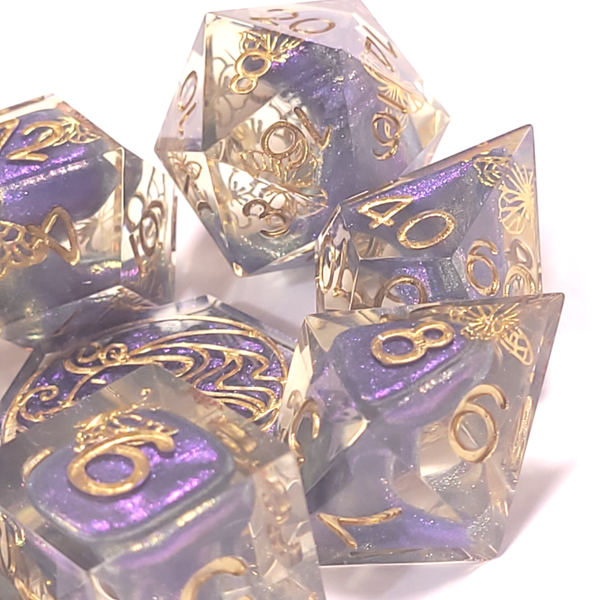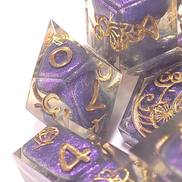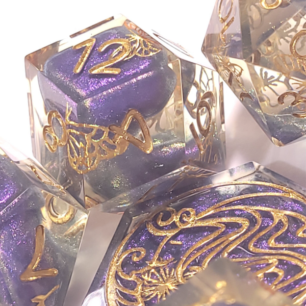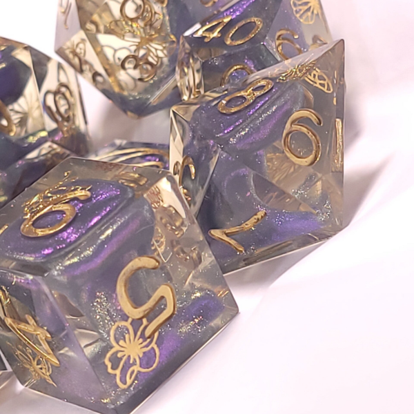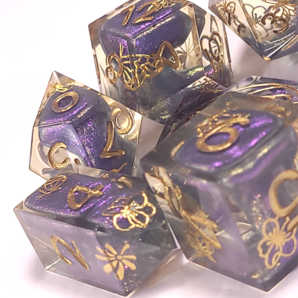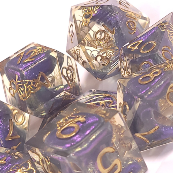 This set is a slightly yellowed resin with color shifting bloops. Topped with gold buterflies and florals. Inked in gold.