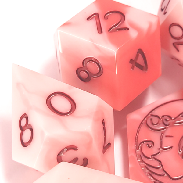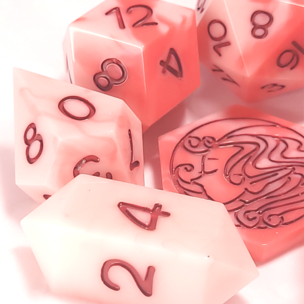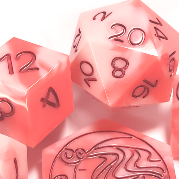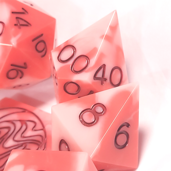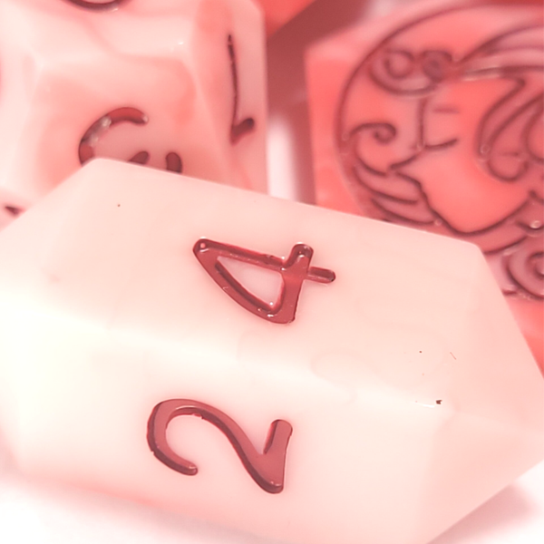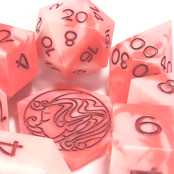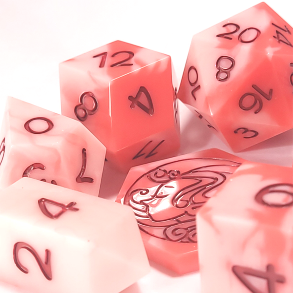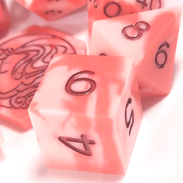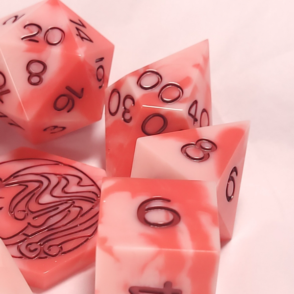 This set is a marbling of white, pink, and red. Inked in a deep red.