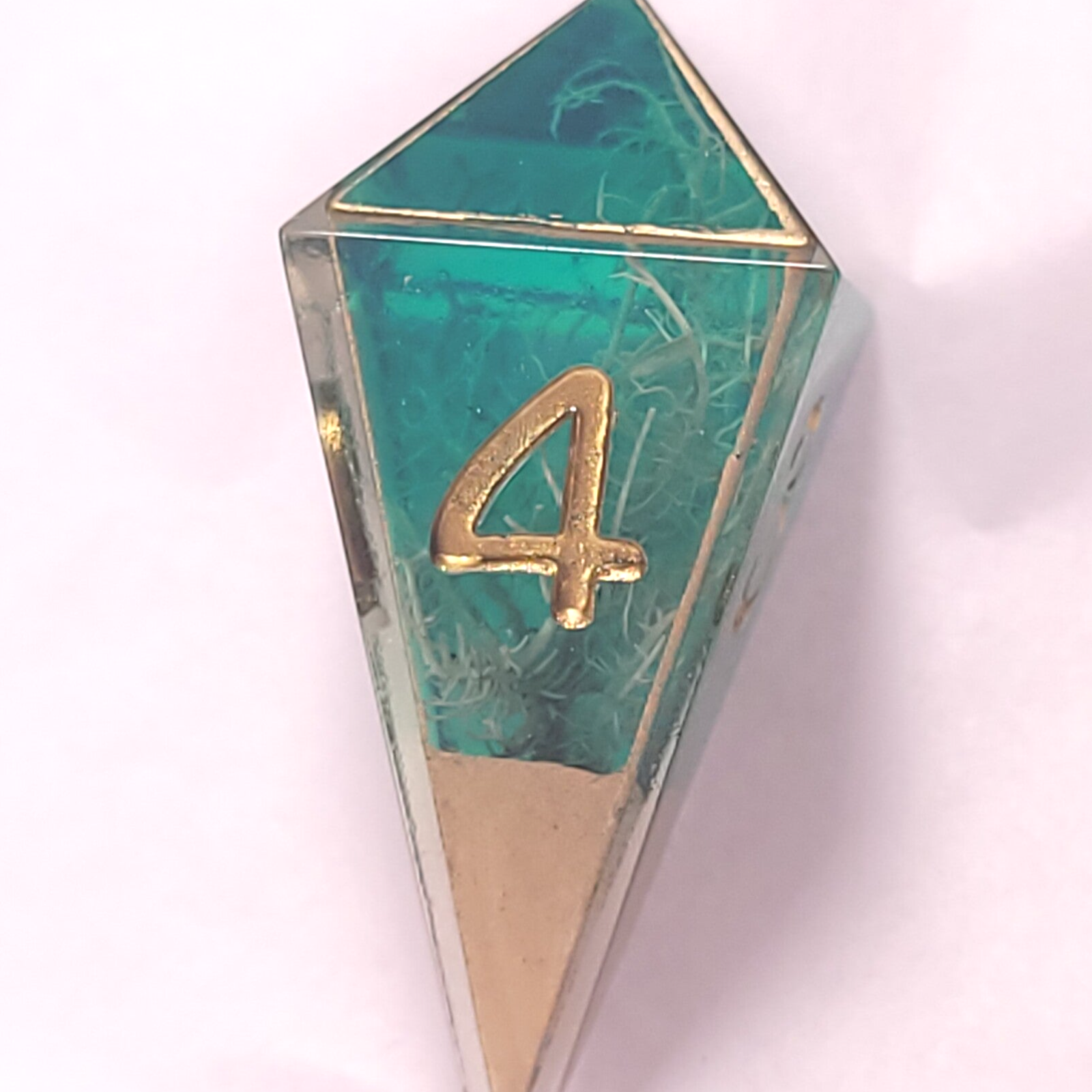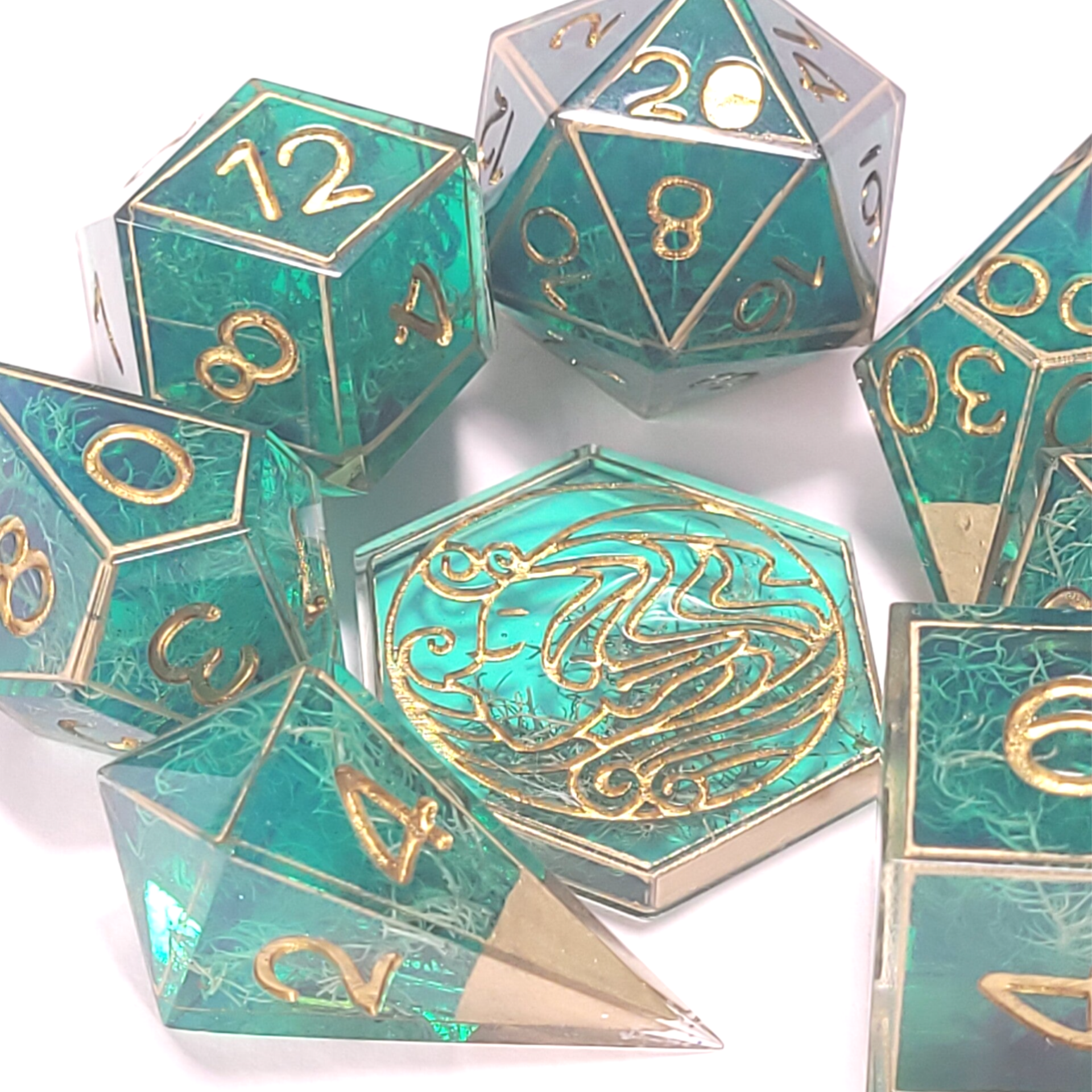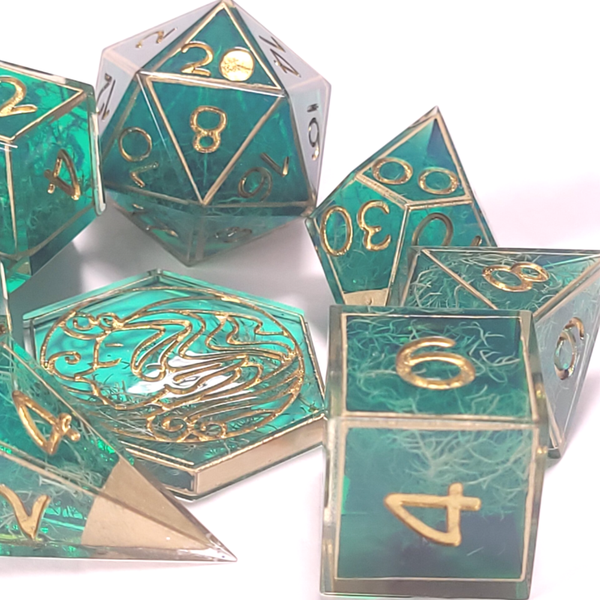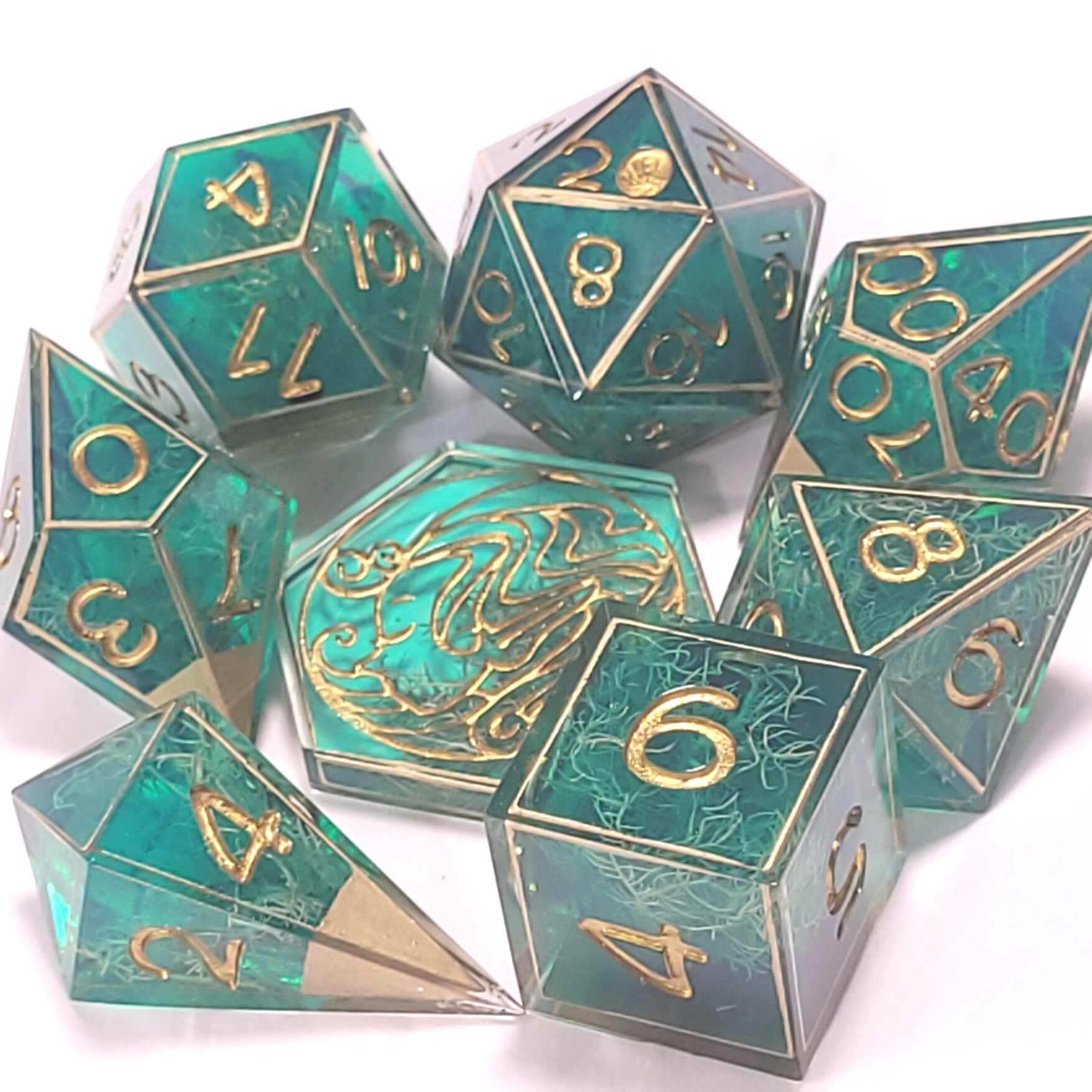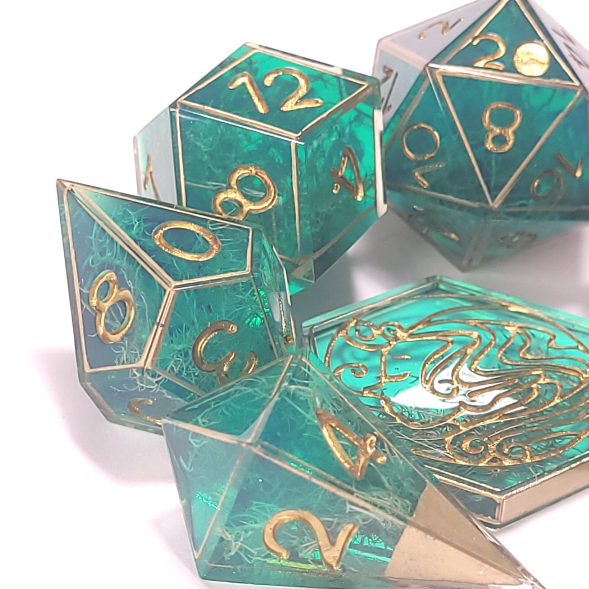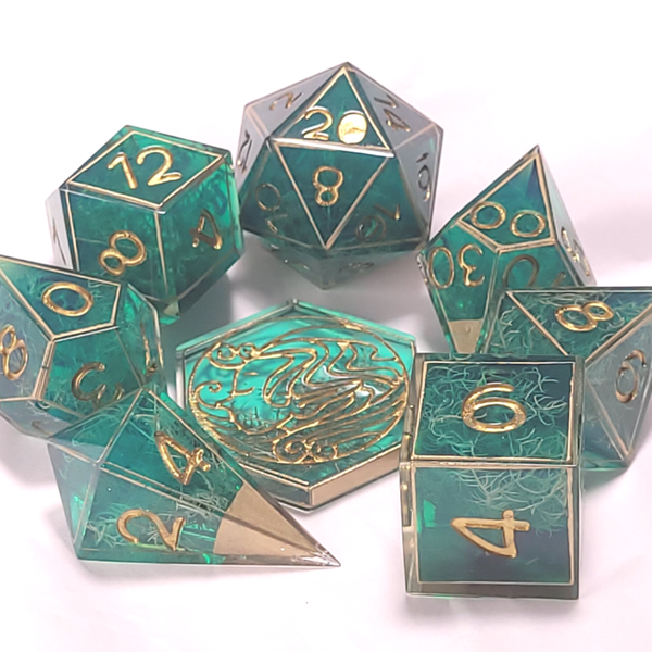 This set is a loveley teal resin with moss. Caged in gold and inked in gold.
