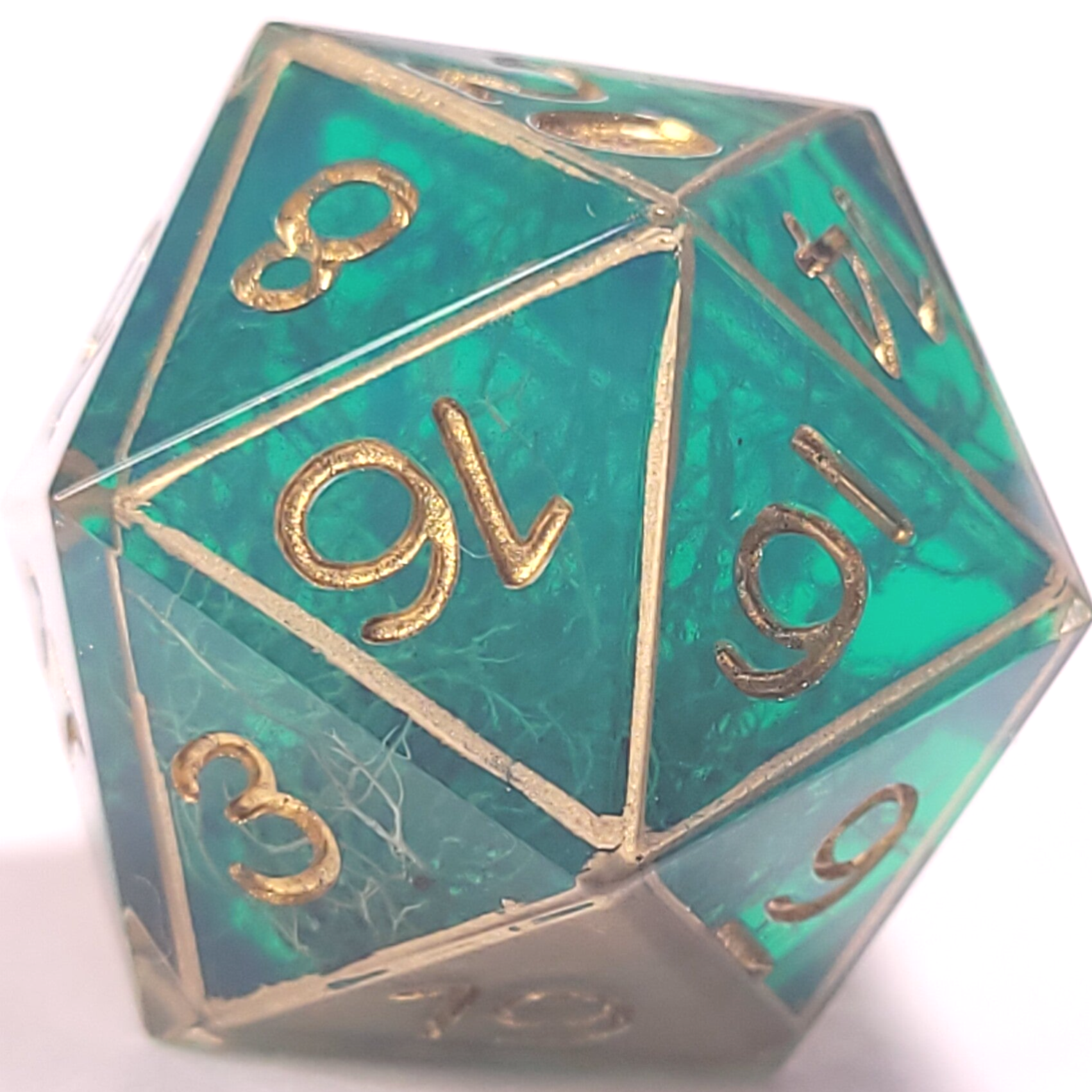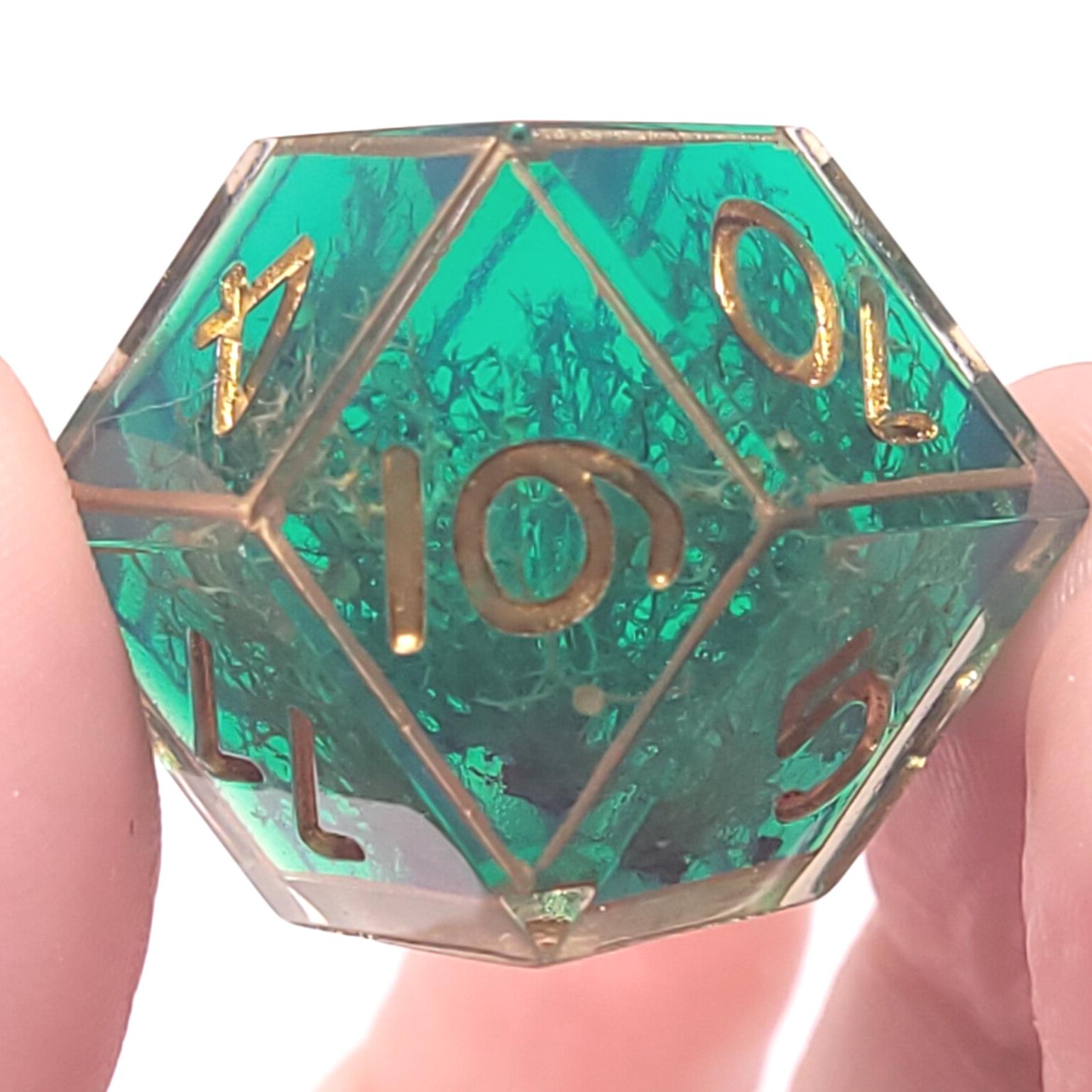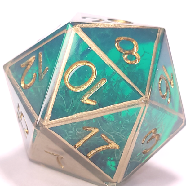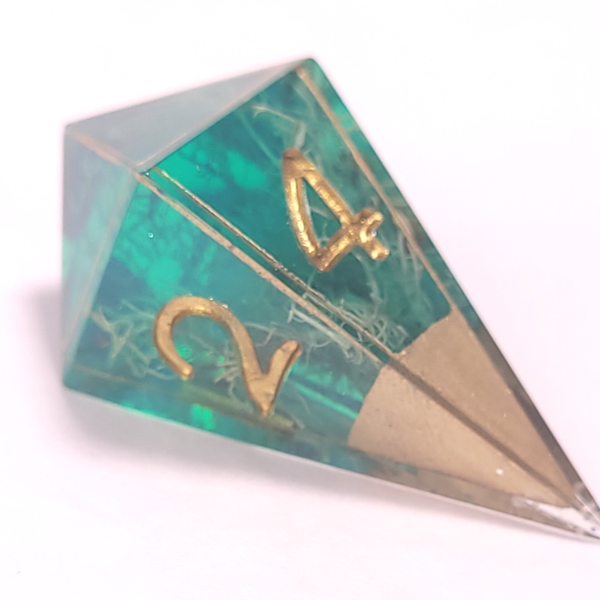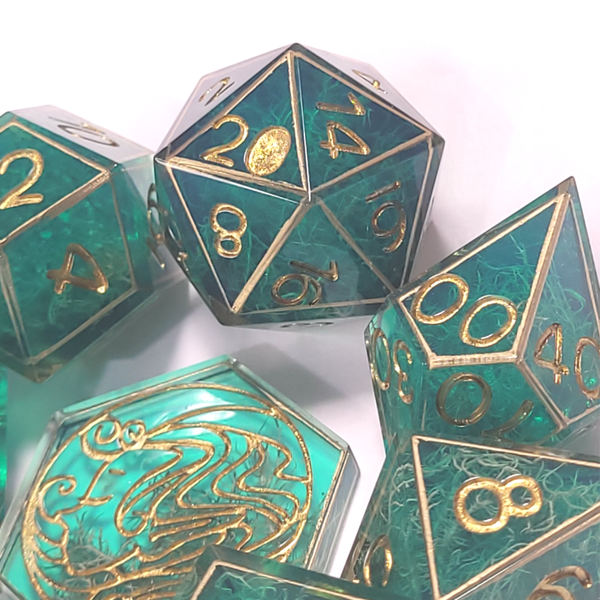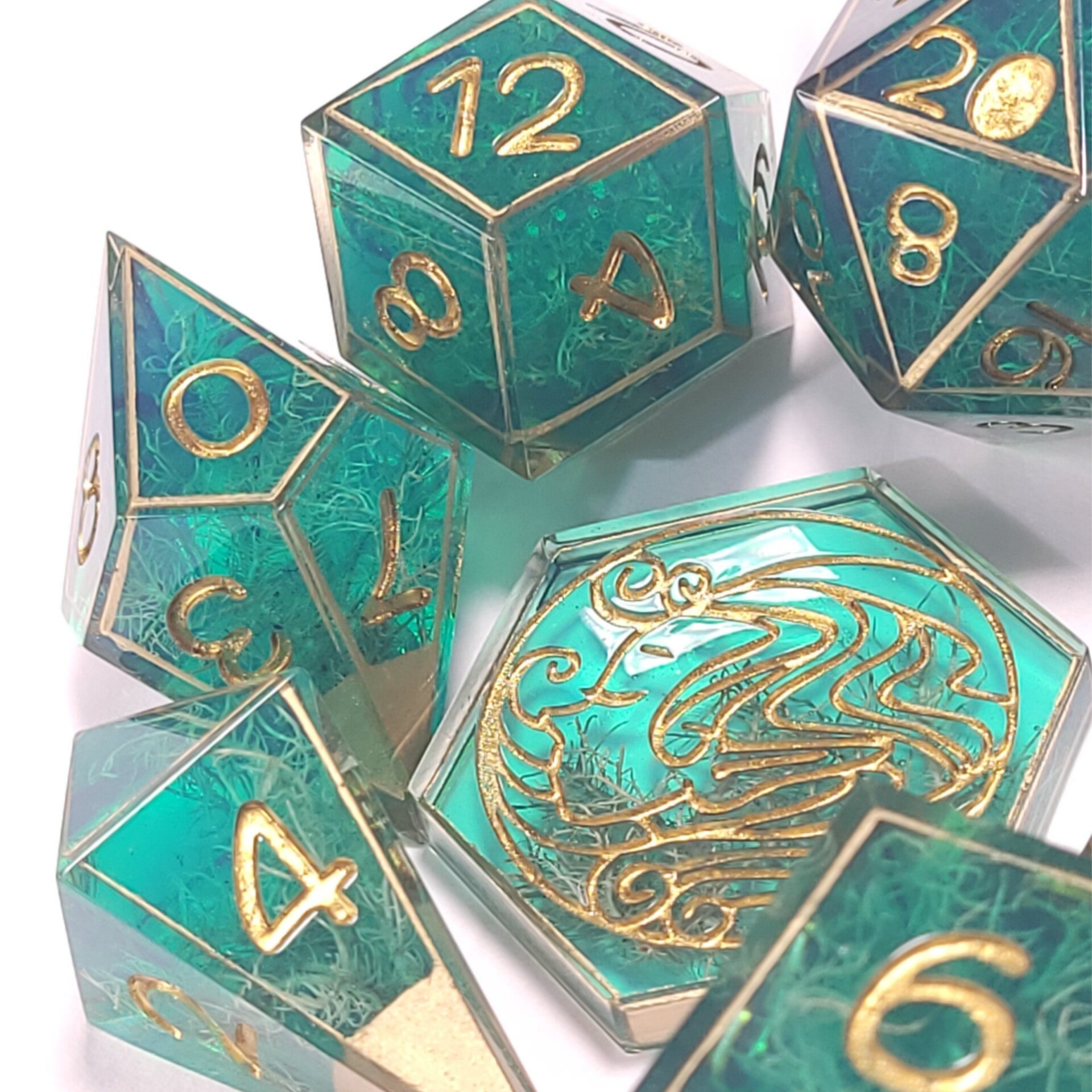 This set is a loveley teal resin with moss. Caged in gold and inked in gold.