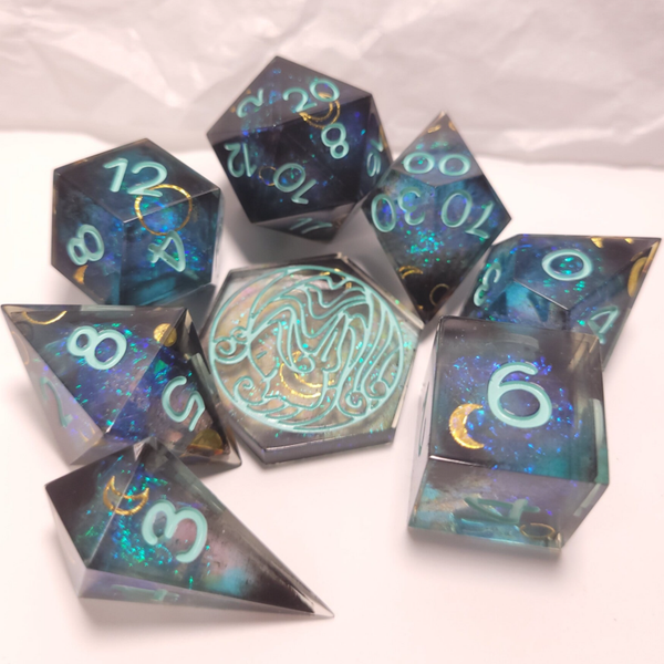 This set is a blue and purple tinted resin with shifting mylar dusted on the vertexies with black. Decorated with gold moons. Inked in a pale blue.