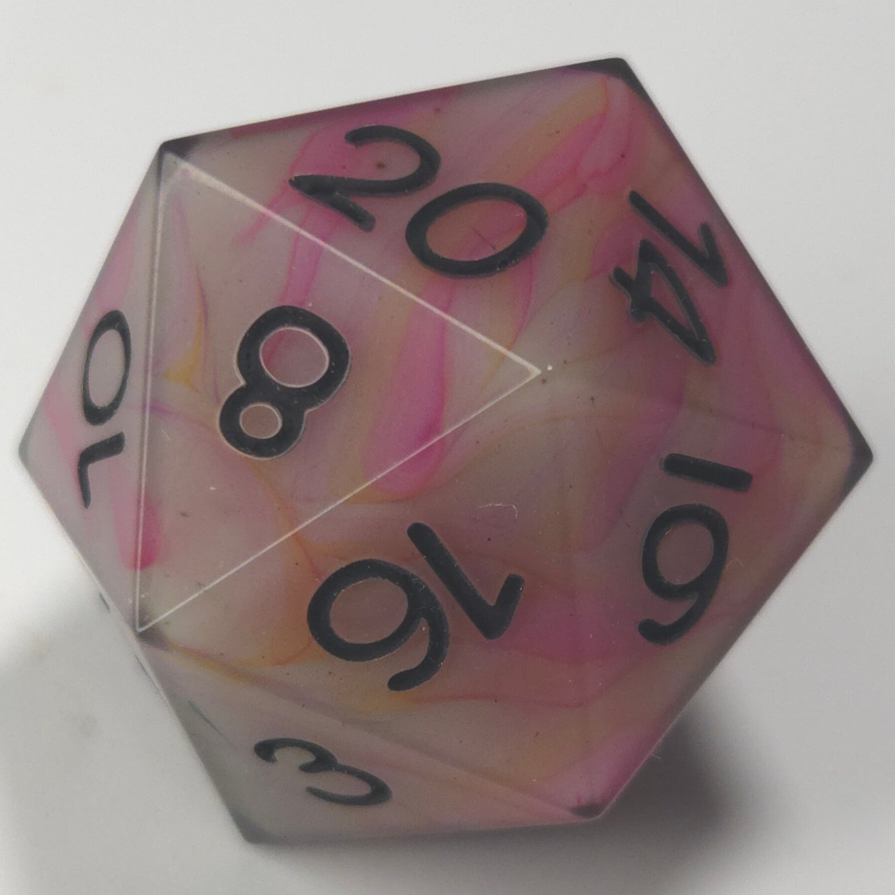 This die is a colorful stripey center with a translucent black shell. Inked in black.