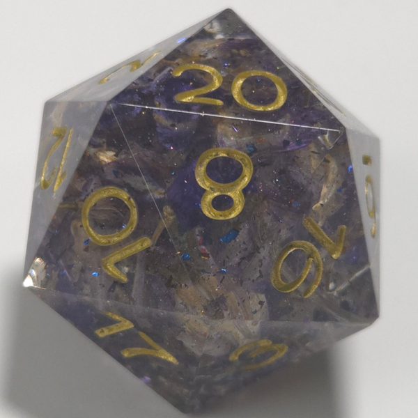 This die is a clear resin with colorshifting blue-gold mica and cornflower petals inked in gold.