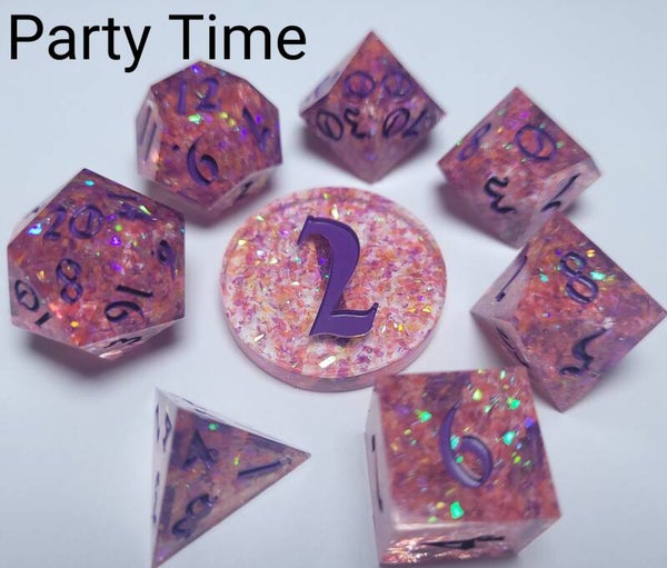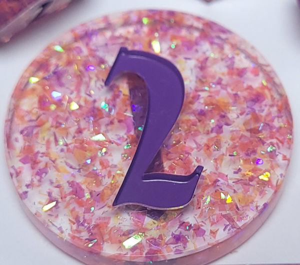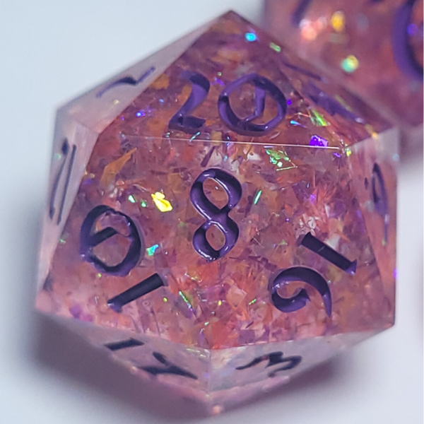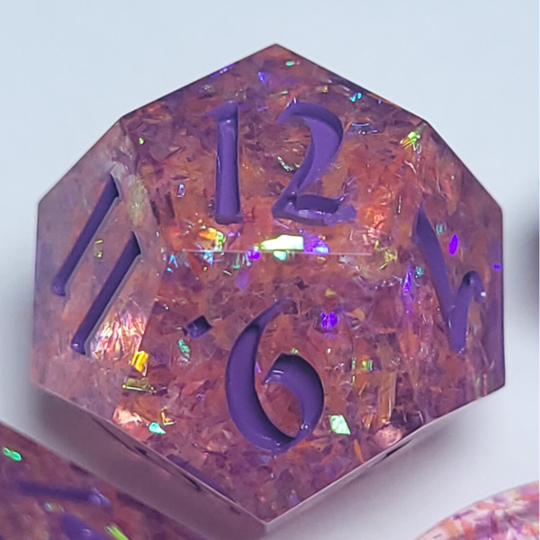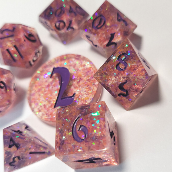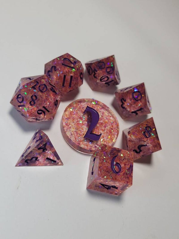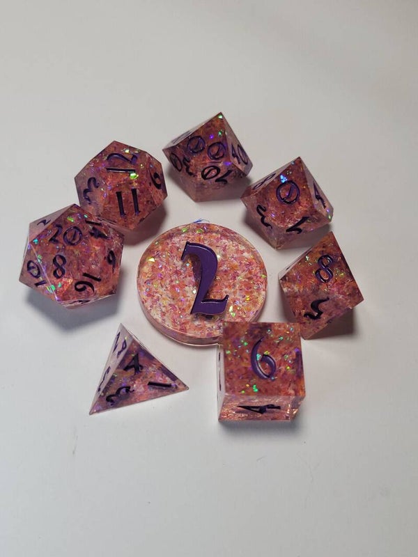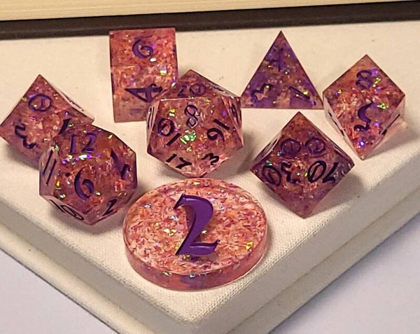 This is a lovely 8 piece set. A clear base with iridescent flakes in orange and purple inked in a violet.