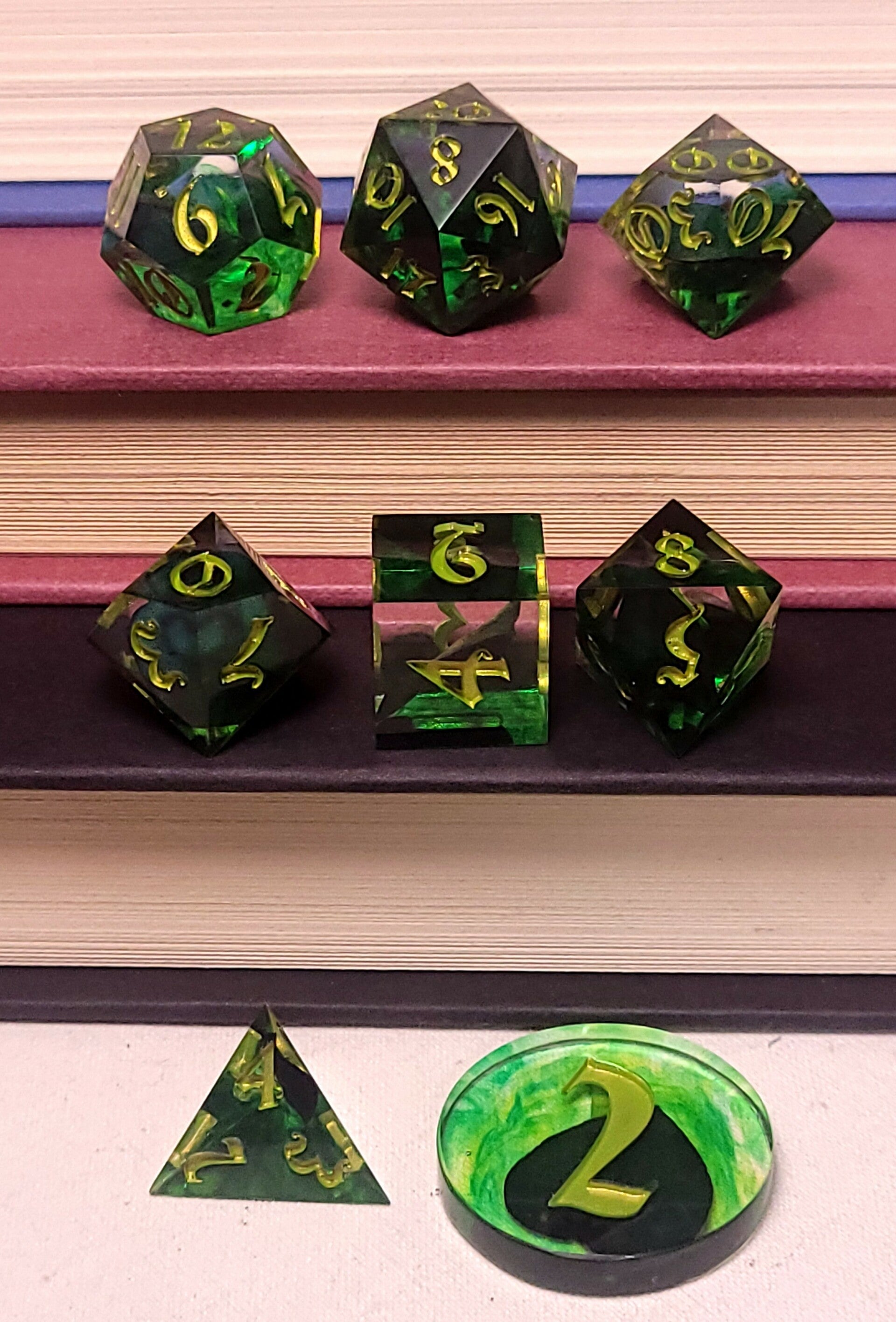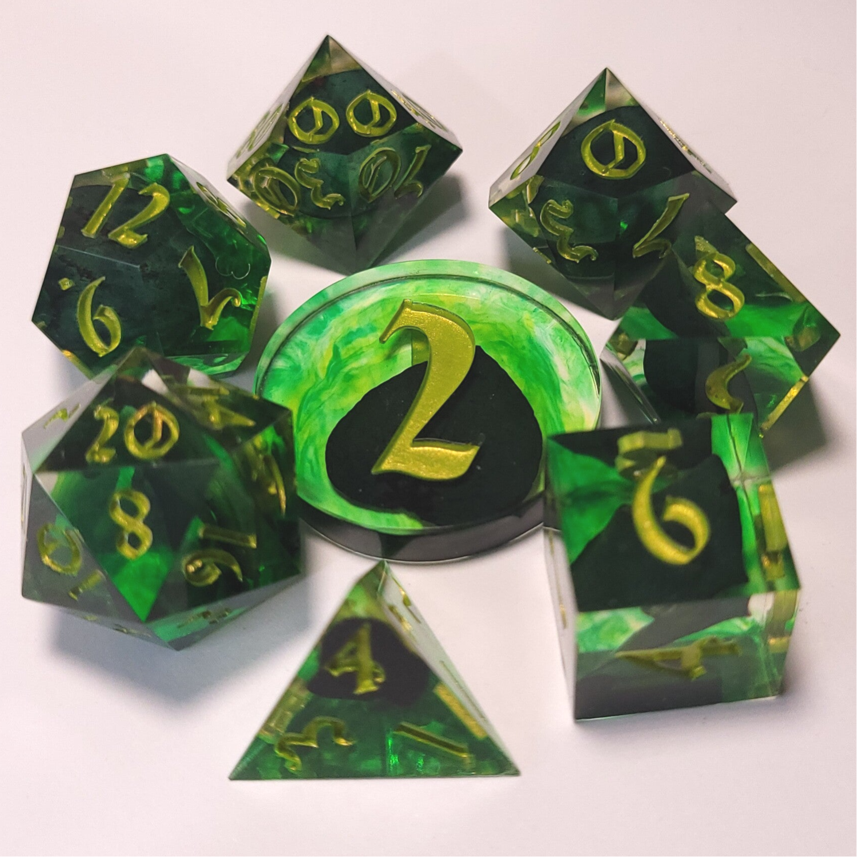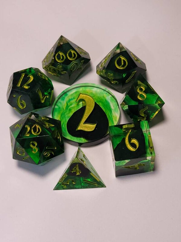 This set is a clear base with different shades of transparent green and eucalyptus leaves in it. Inked in a green/gold.