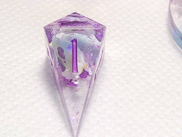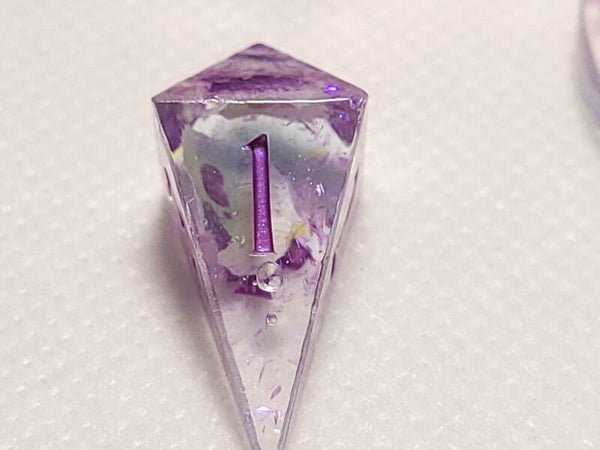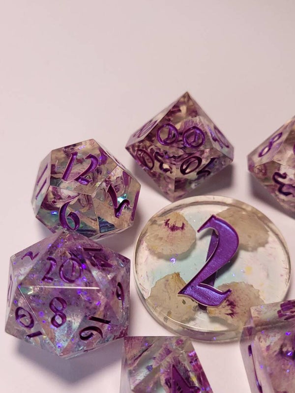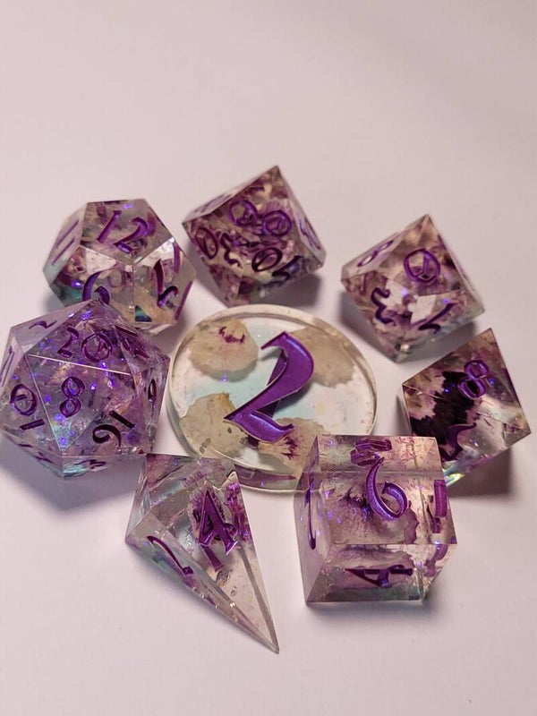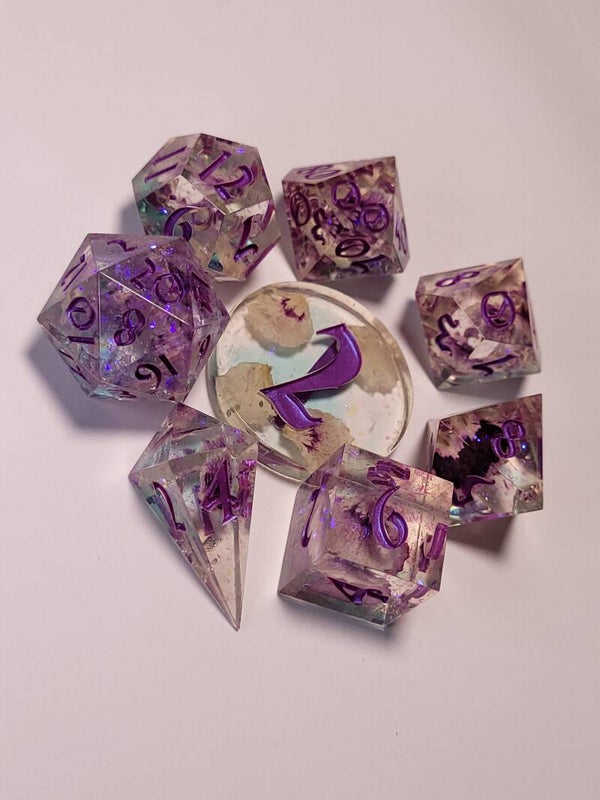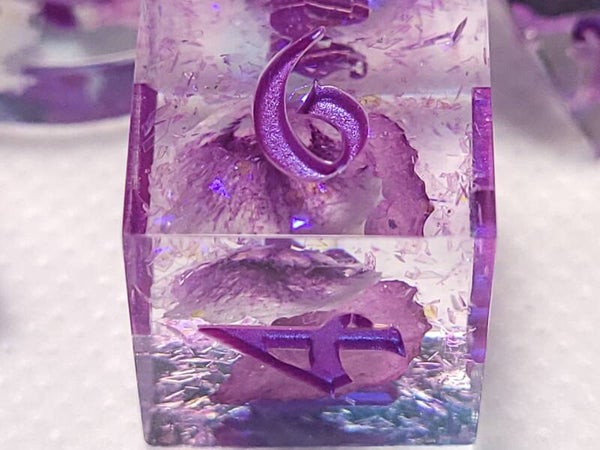 This set is a clear base with a purple irridescent flake and carnation petals. With a small bit of transparent blue. inked in a colorshifting purple to blue.