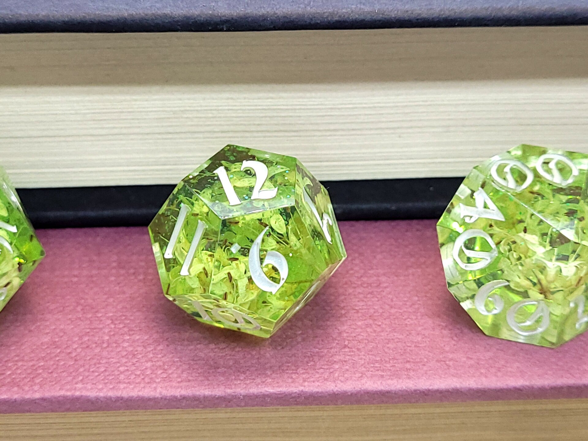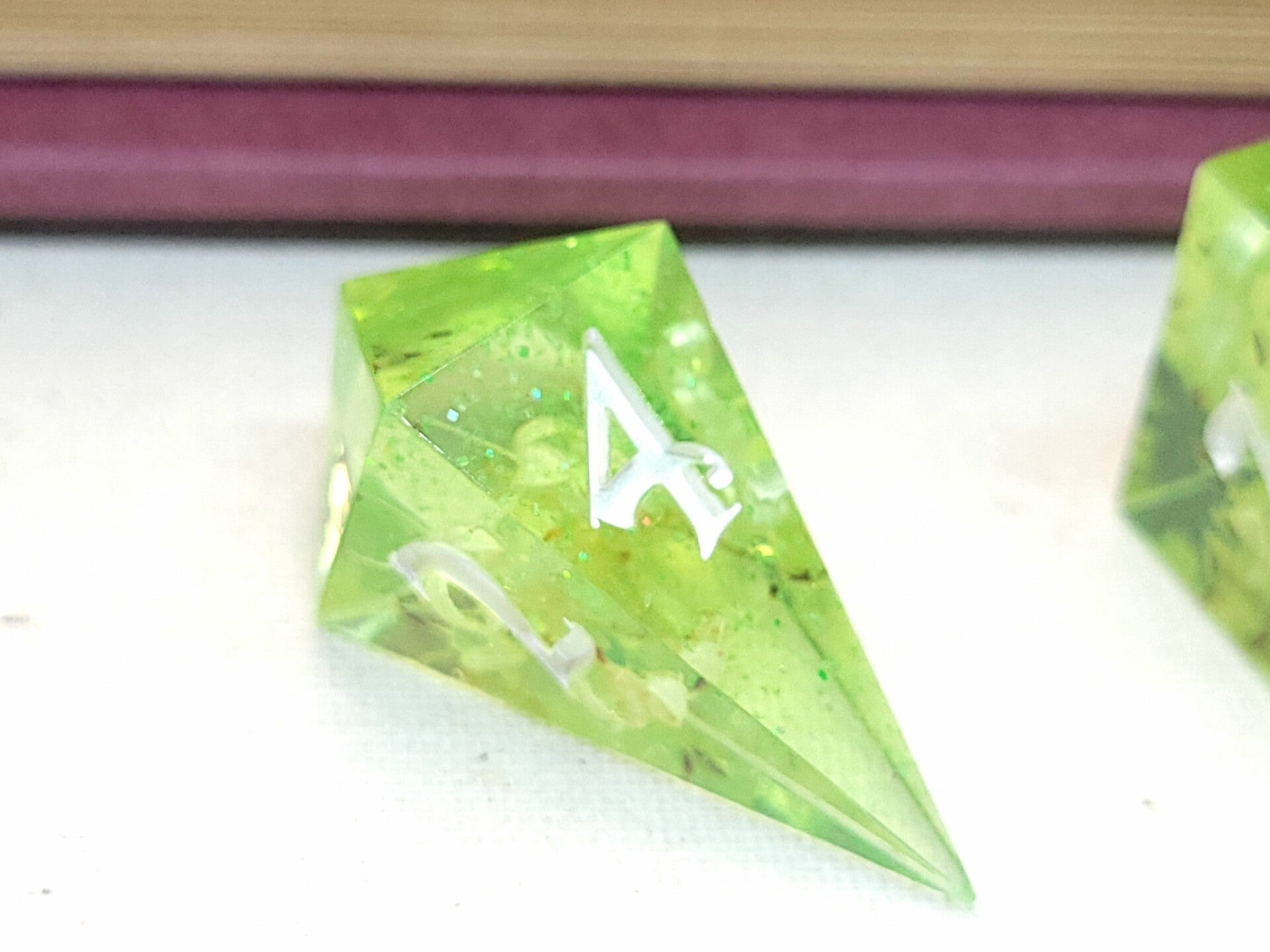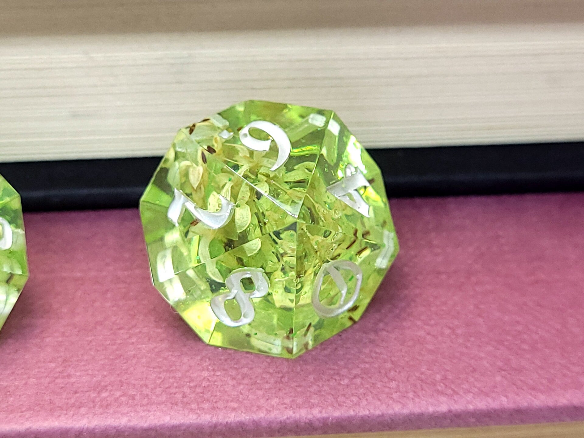 This set is an 8 piece set with a shard d4. This set is a pale grass green resin with white flower inclusions inside. Inked in a pearl white.