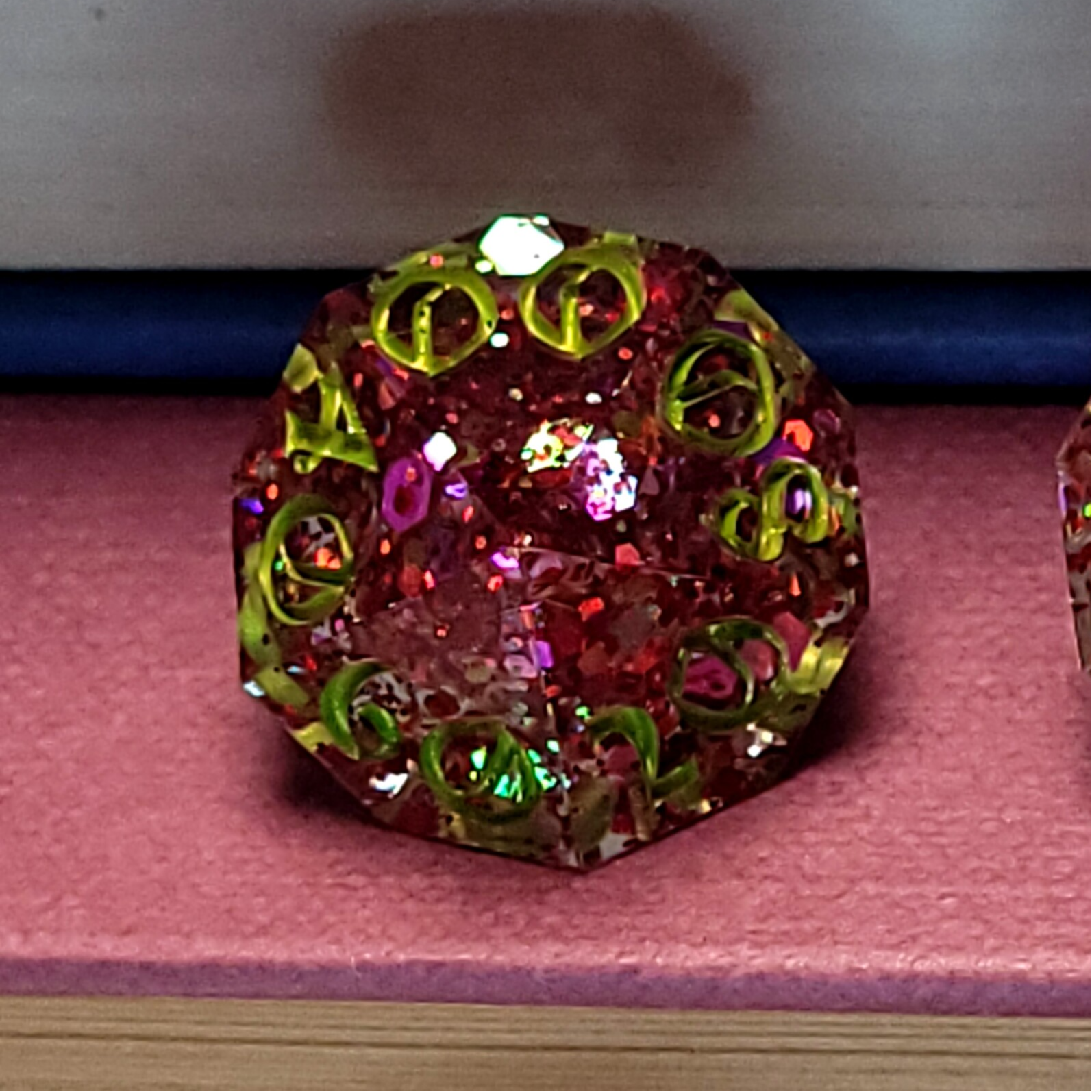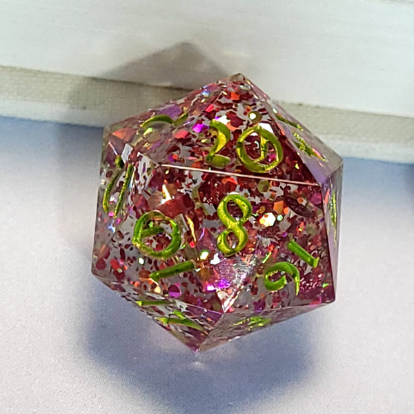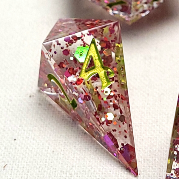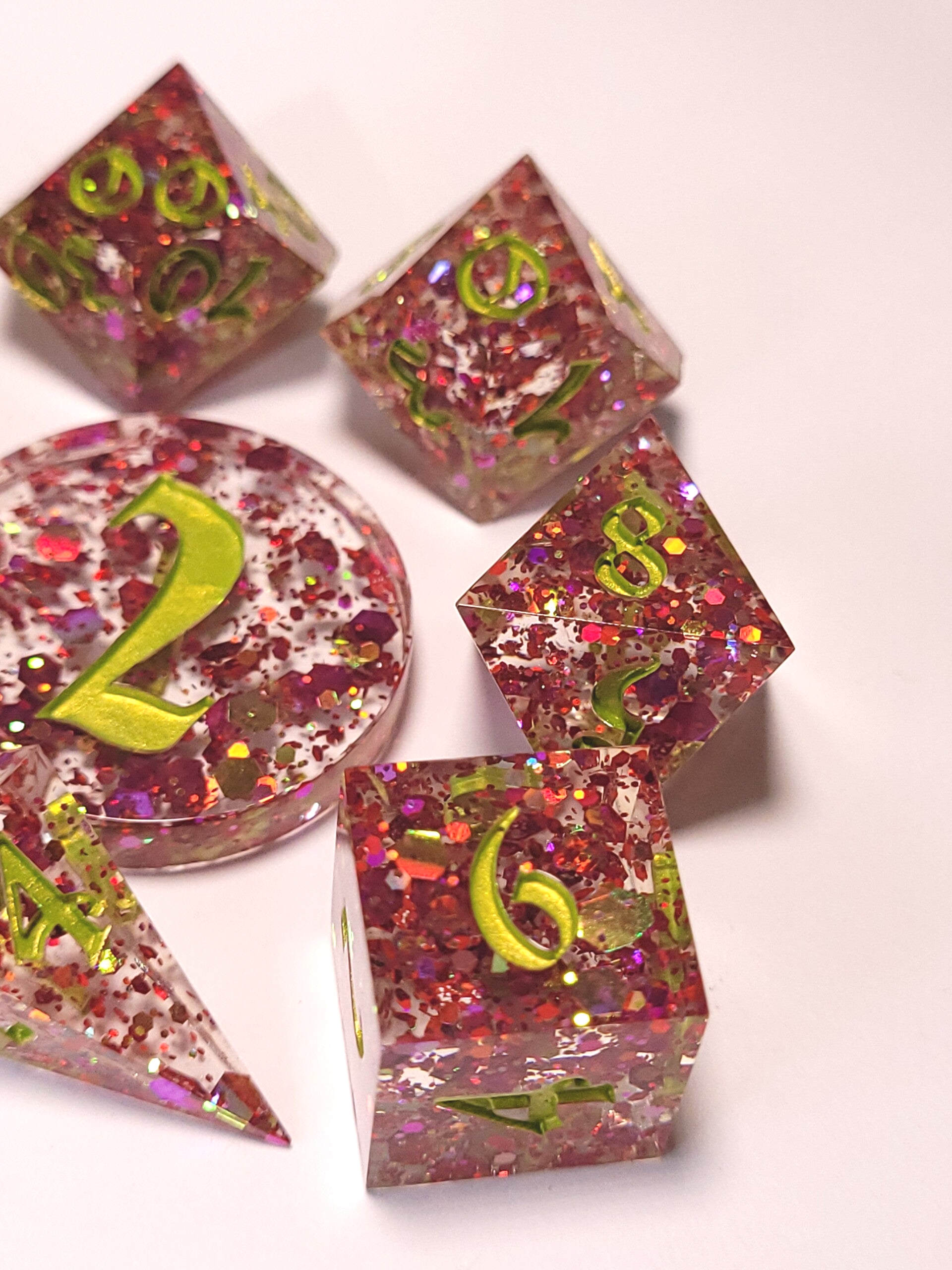 This set is a clear base with a color shifting multi-sized glitter that shifts between pink, orange and green. This set is inked in a spring green that matches the green in the glitter.