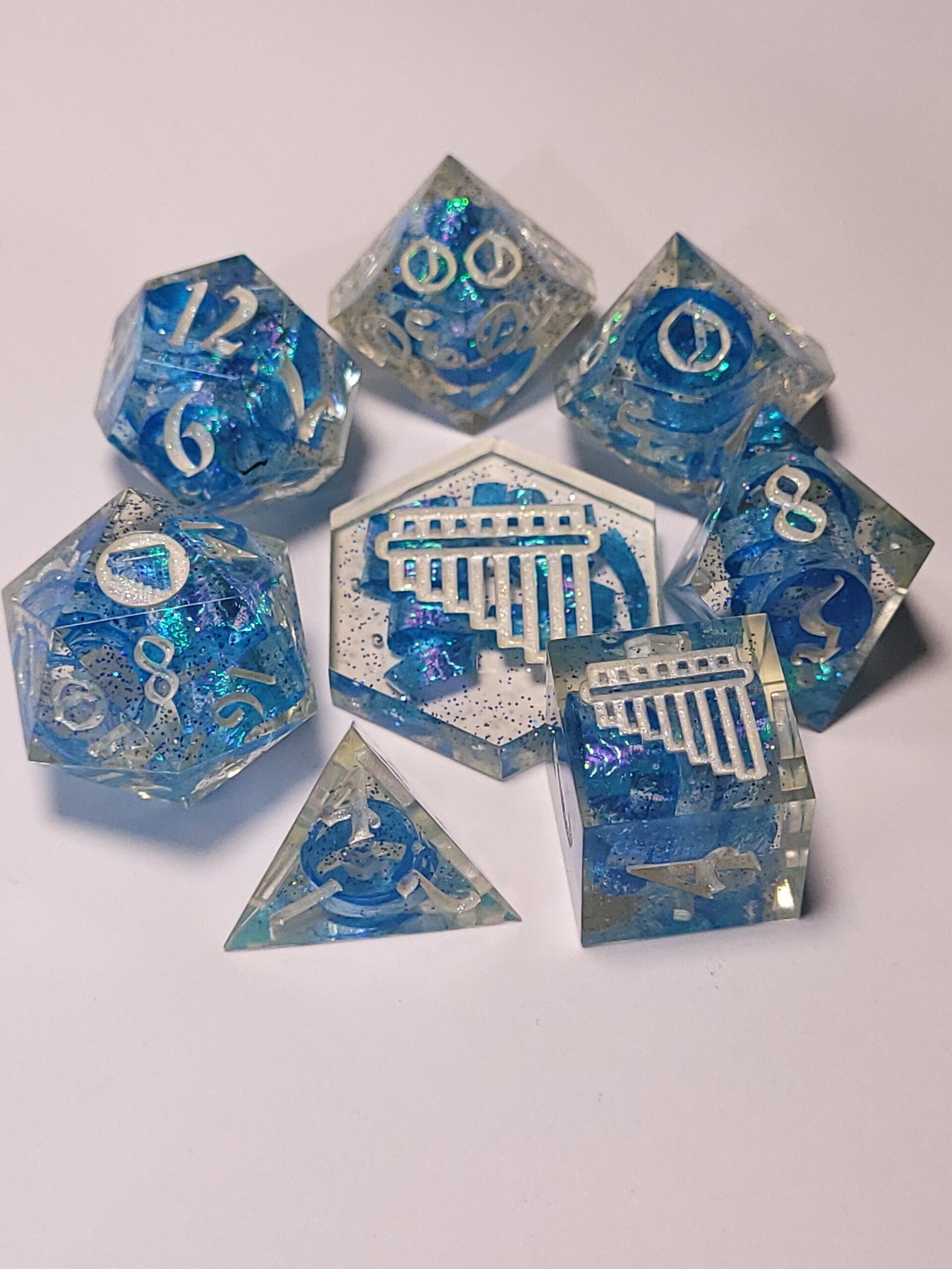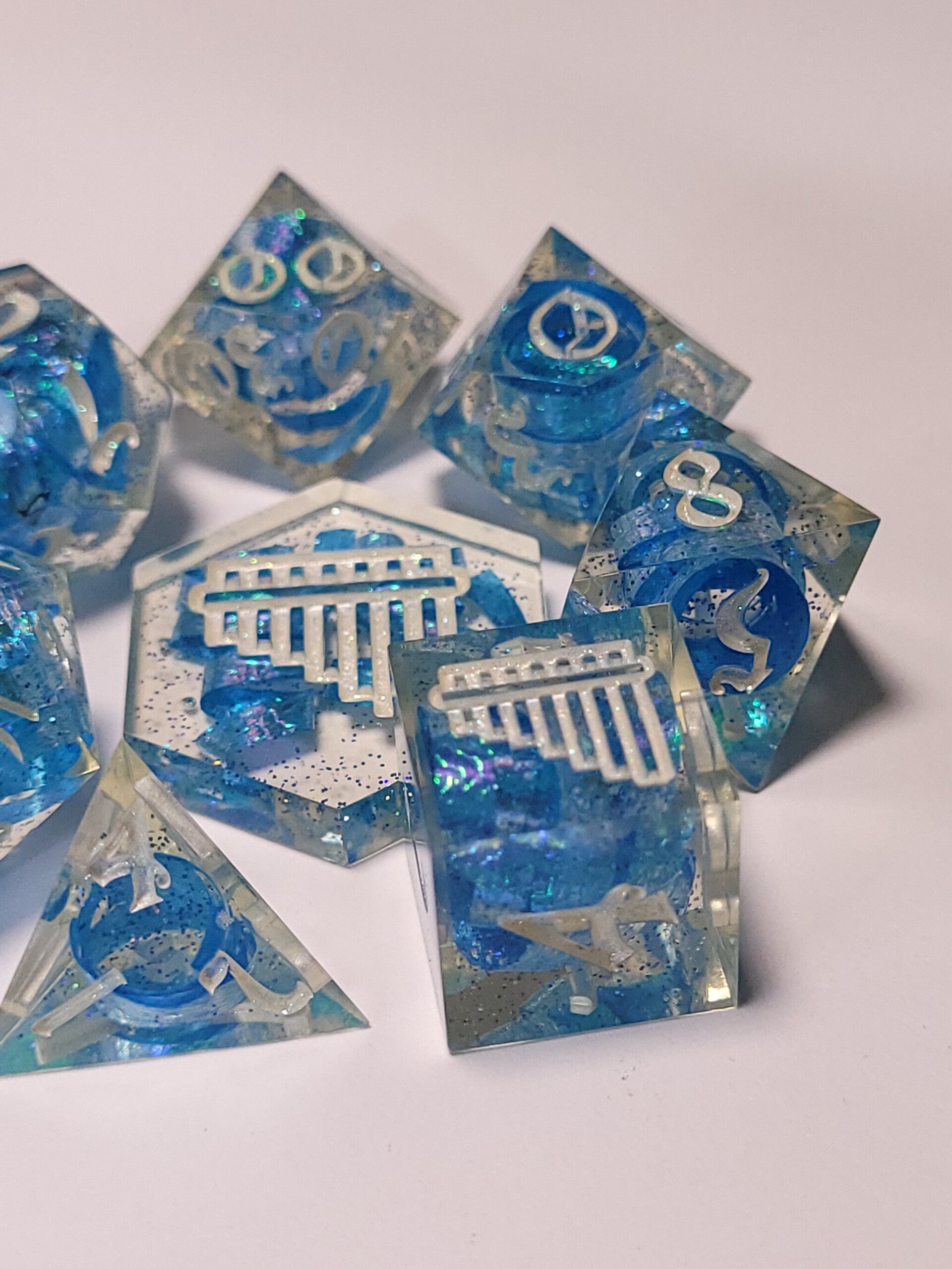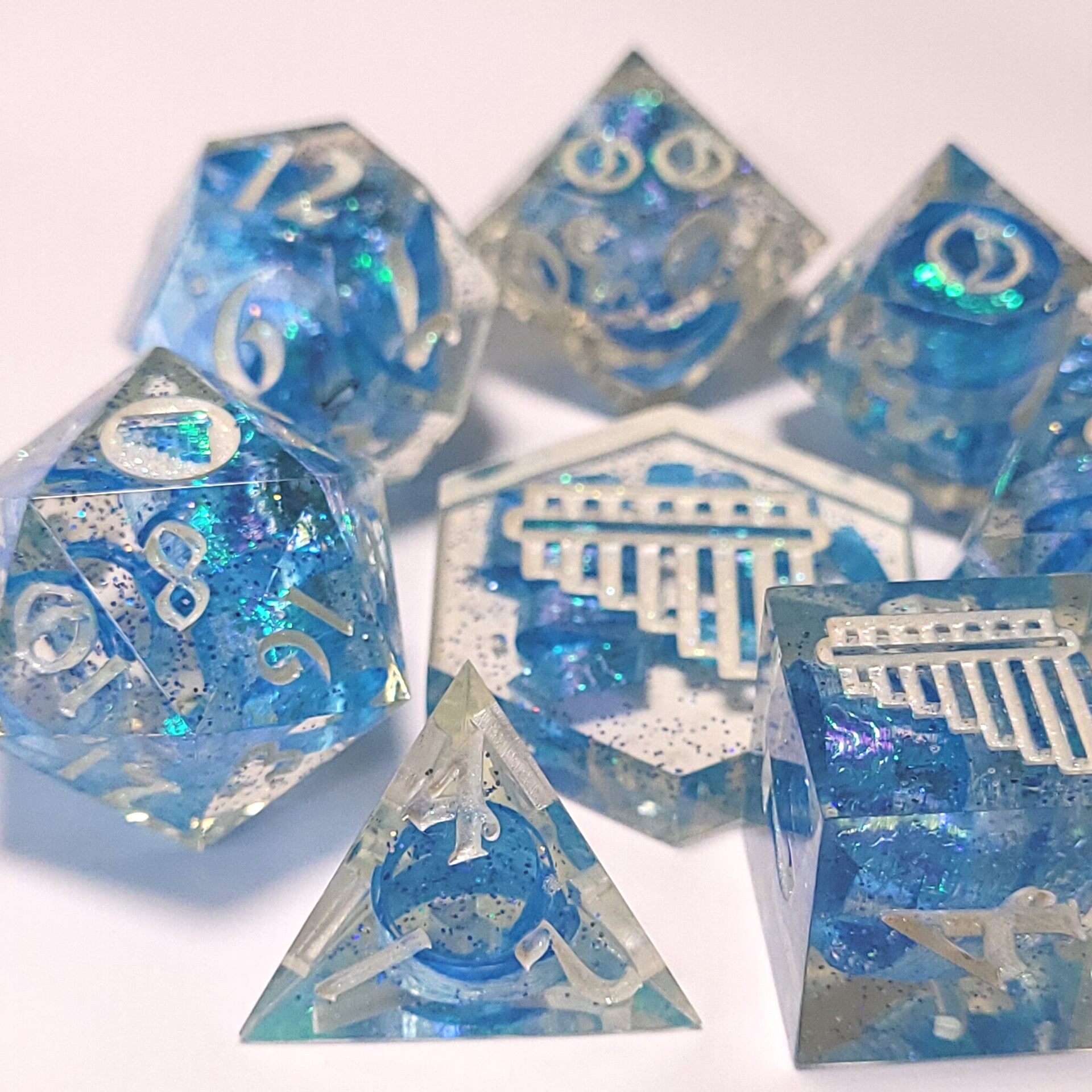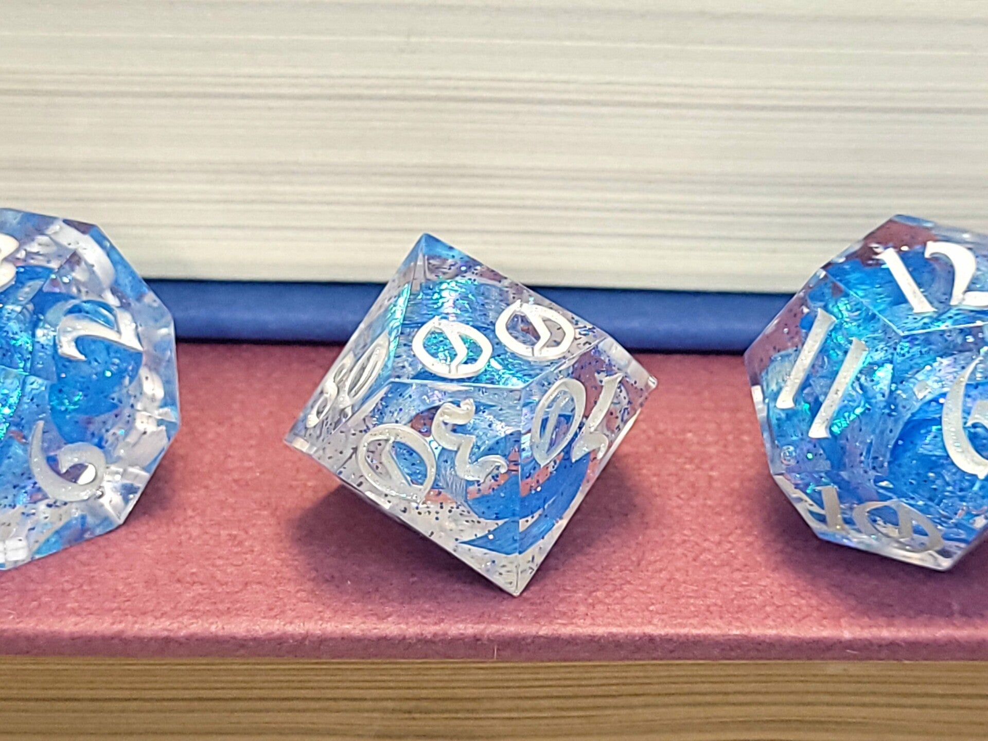 This set is a clear base with iridescent blue ribbon and blue holographic glitter. Inked in a pearly white with an iridescent glitter on top.