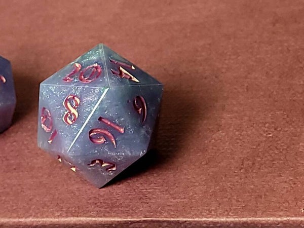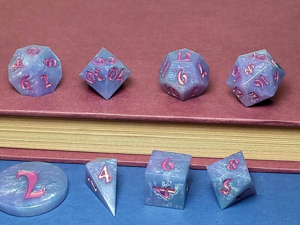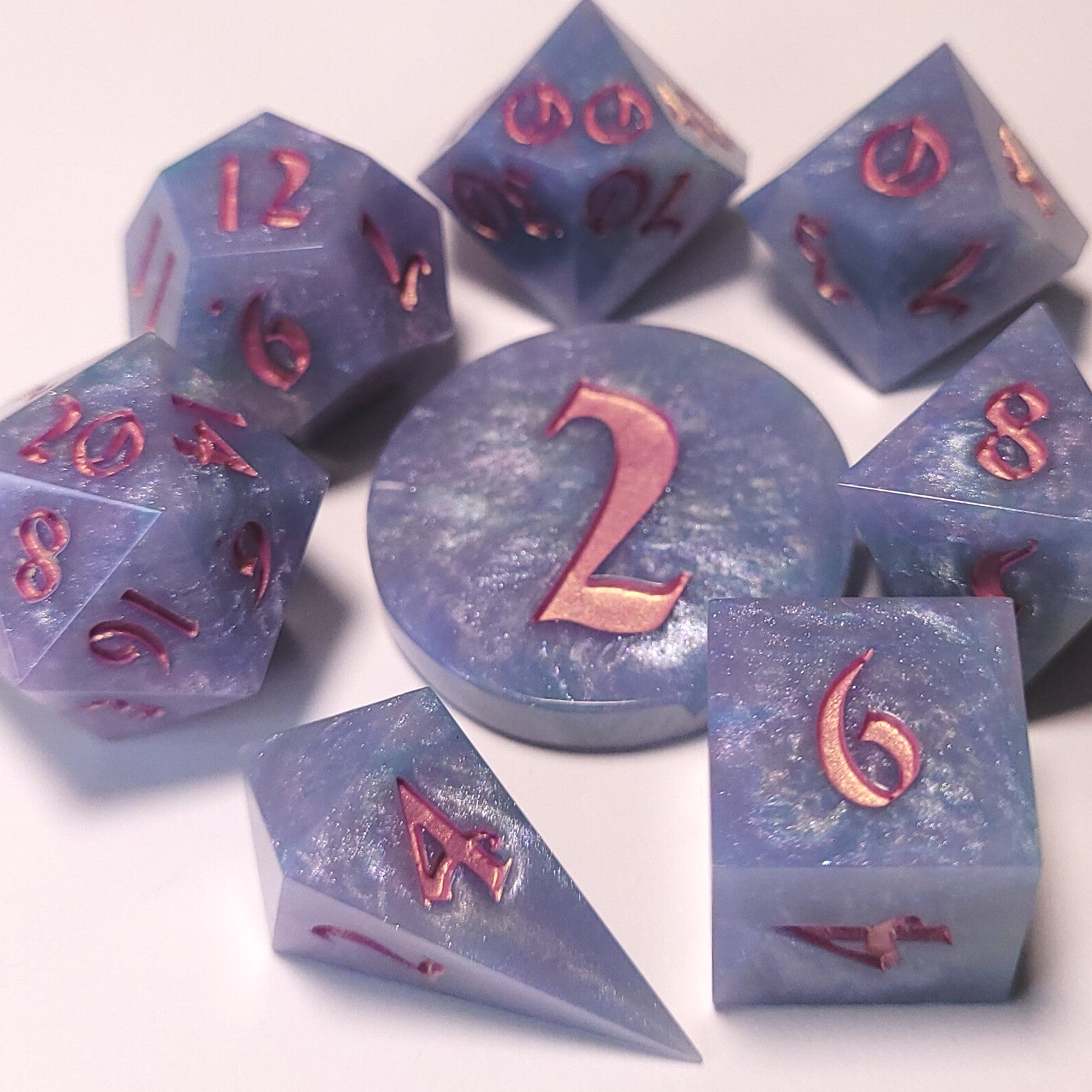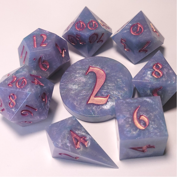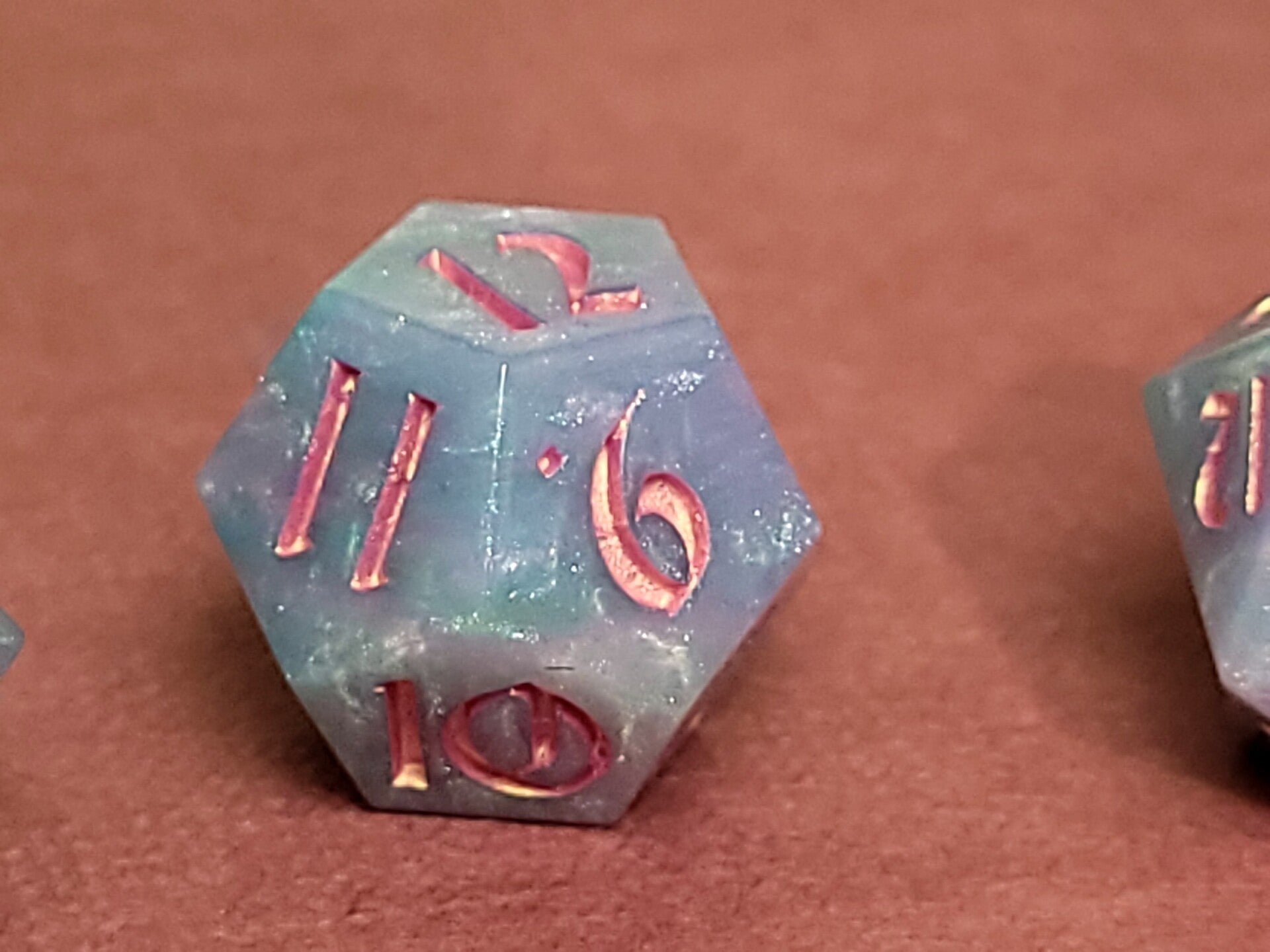 This set is a mixed color pour that mixed quite a bit. Pastel blue pink green and purple. Inked in golden pink.