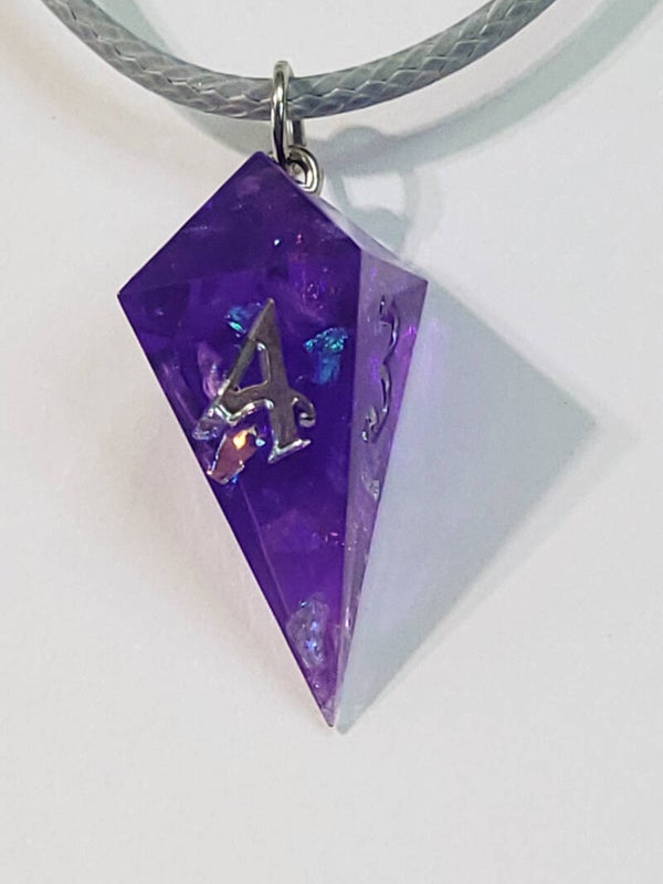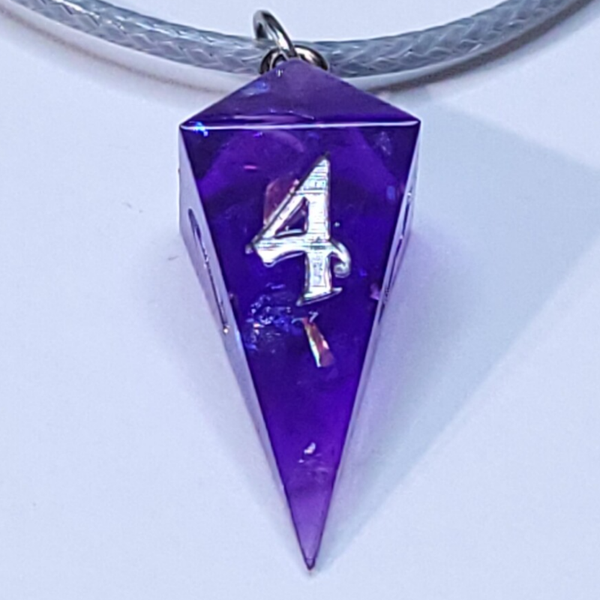 These necklaces are a small (1.25 inch, 3cm) shard d4 purple with mylar flakes inked in chrome.