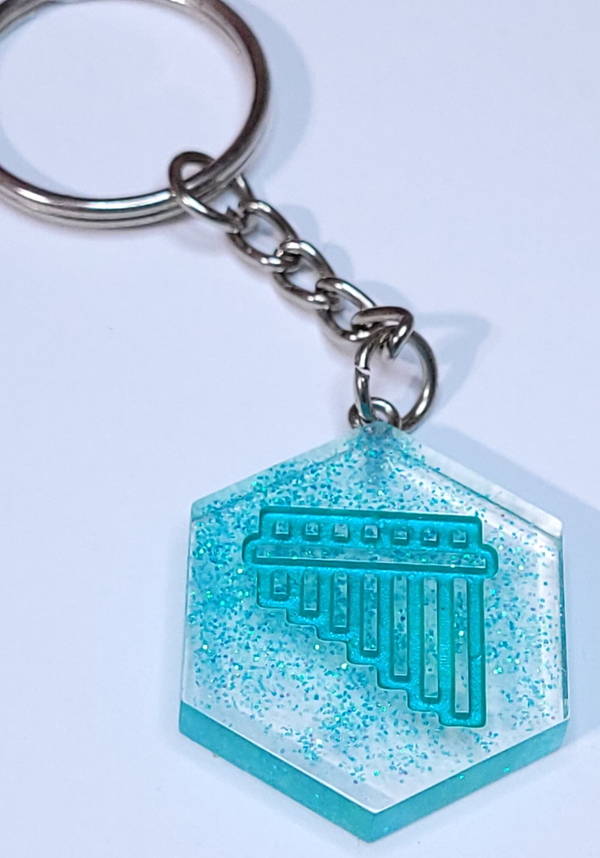 This is a clear resin with iridescent blue glitter coin. Inked in a pale blue.