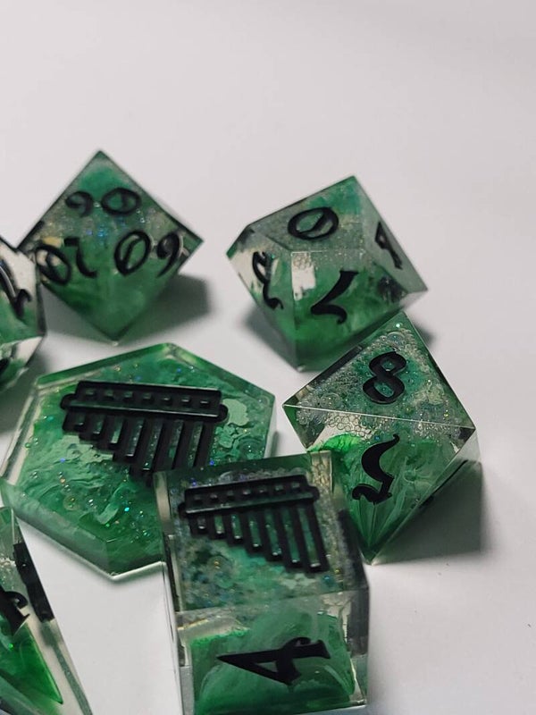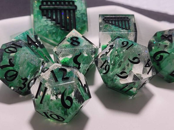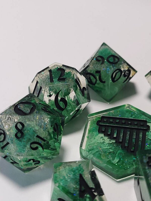 This set is a Clear base with irridescent glitter and irridescent bubbles. With a green petri dripped through. Inked in matte black.
