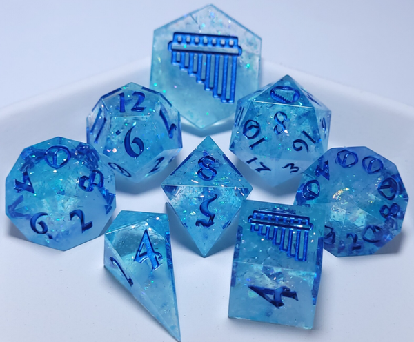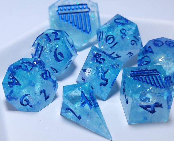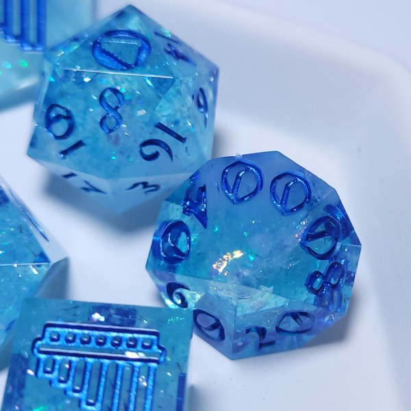 This set is a mixture of 3 transparent resin bases and a white resin base with different glitters flakes and foil. And 2 different shades of blue. Inked in metallic sapphire.
