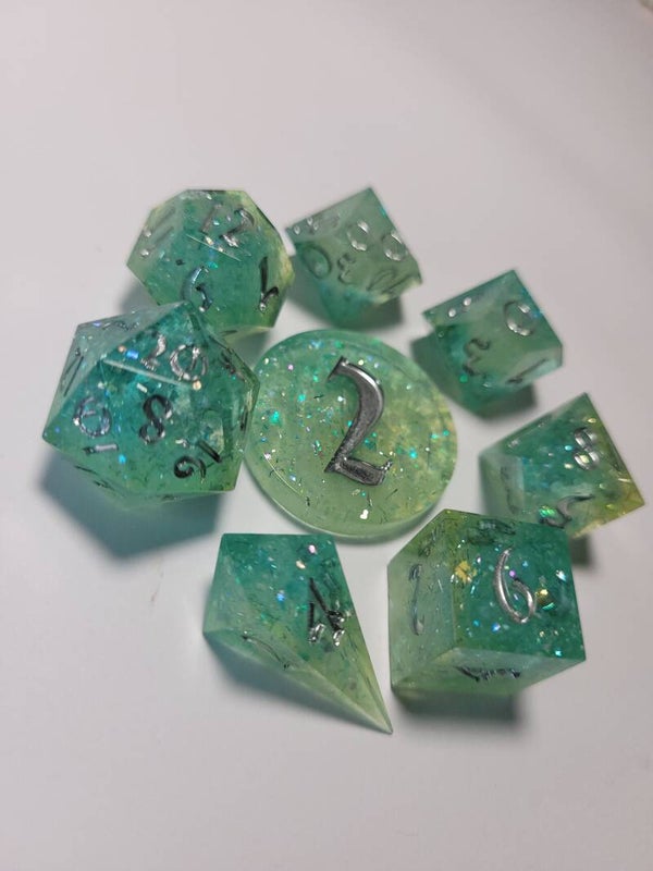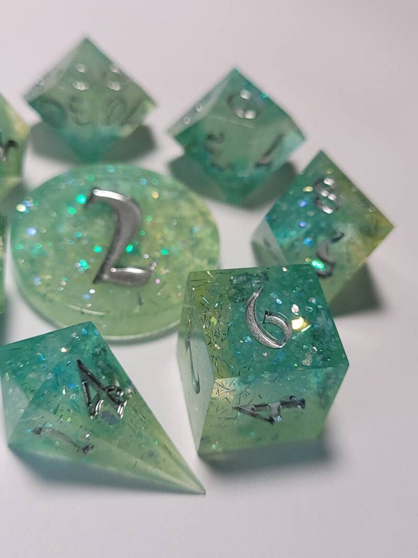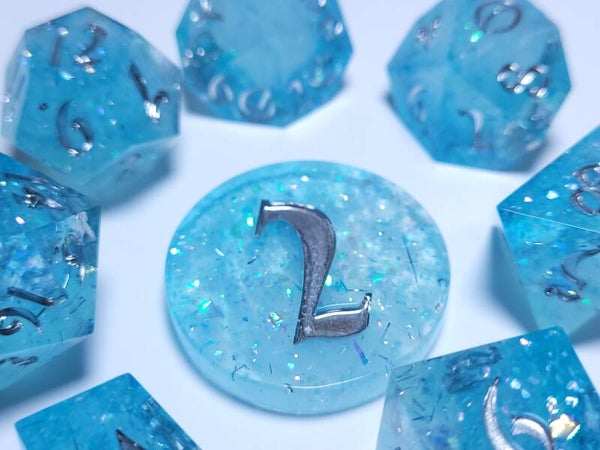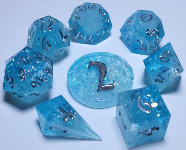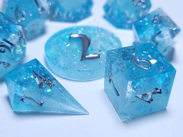 This set is a mixture of 3 transparent resin bases and a white resin base with different glitters flakes and foil. And 2 different shades of blue. Inked in chrome.