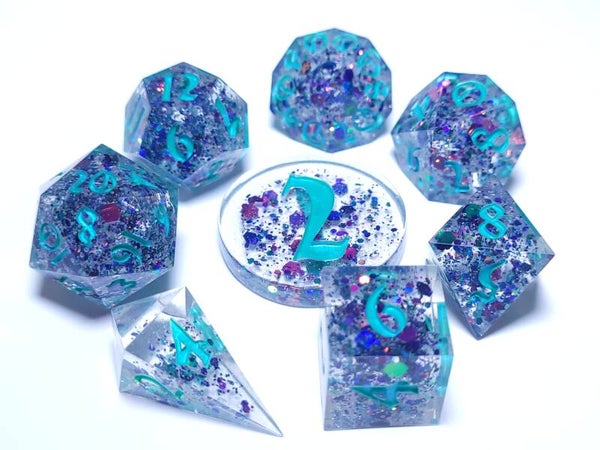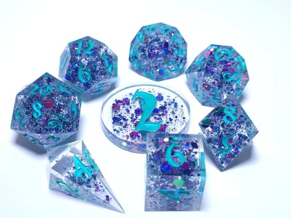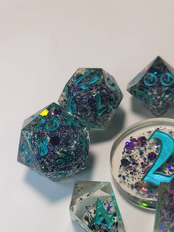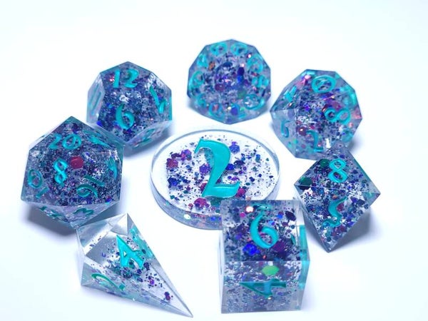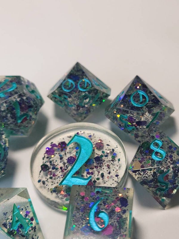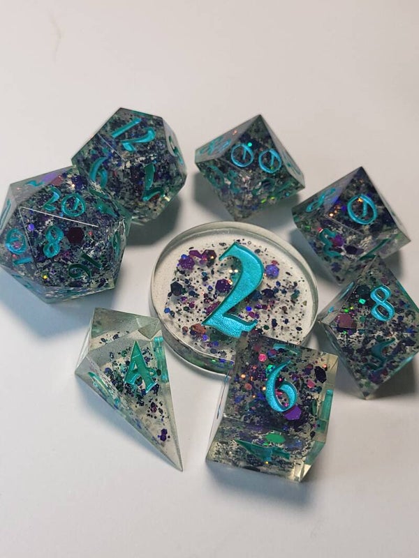 This glitter set is a color shift pink, purple, blue, teal set made with blanks that were cured outside the pressure pot so they have micro bubbles which should not affect your rolling. Inked in a teal blue colorshift.