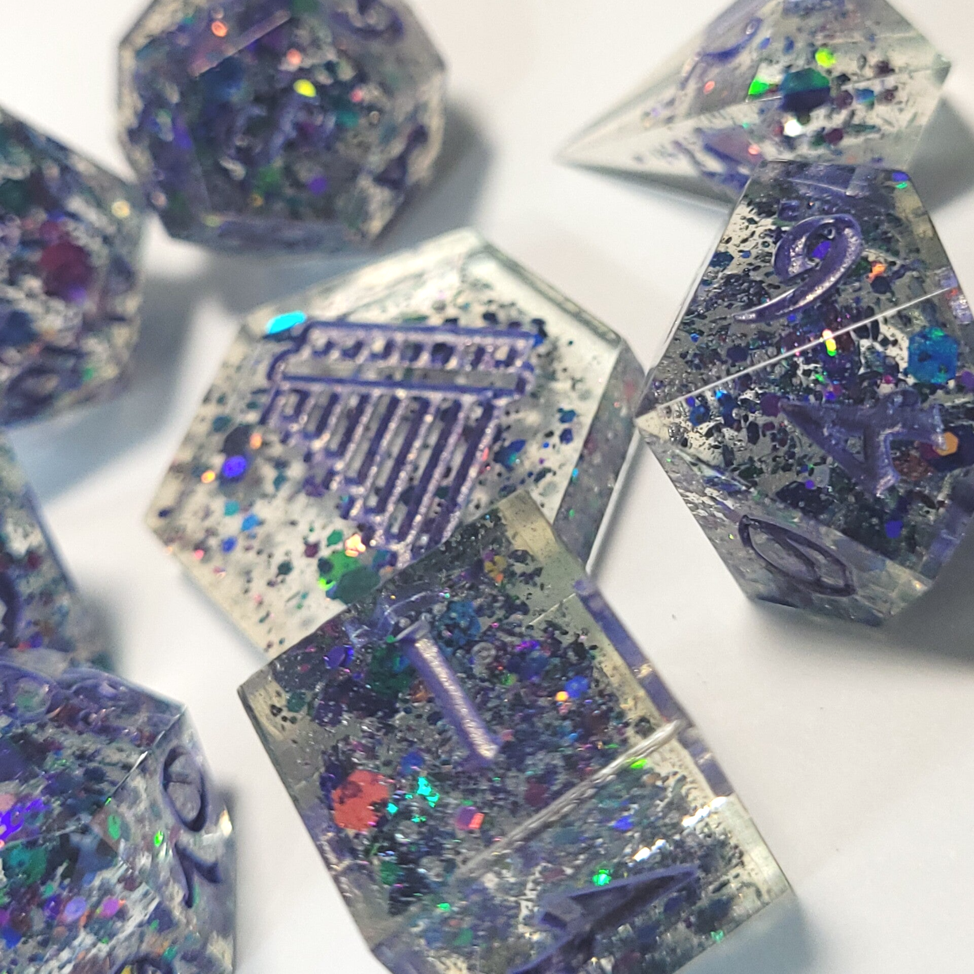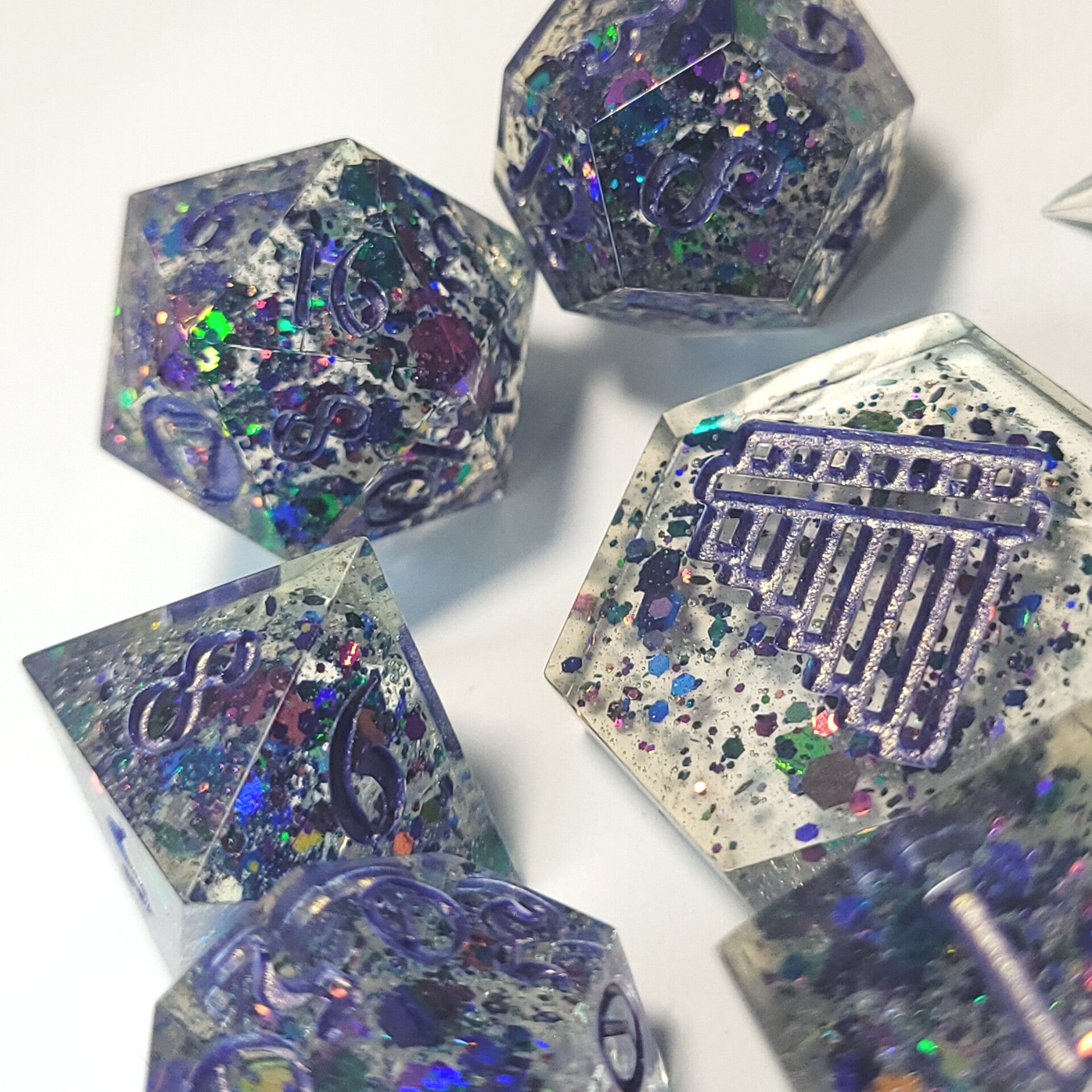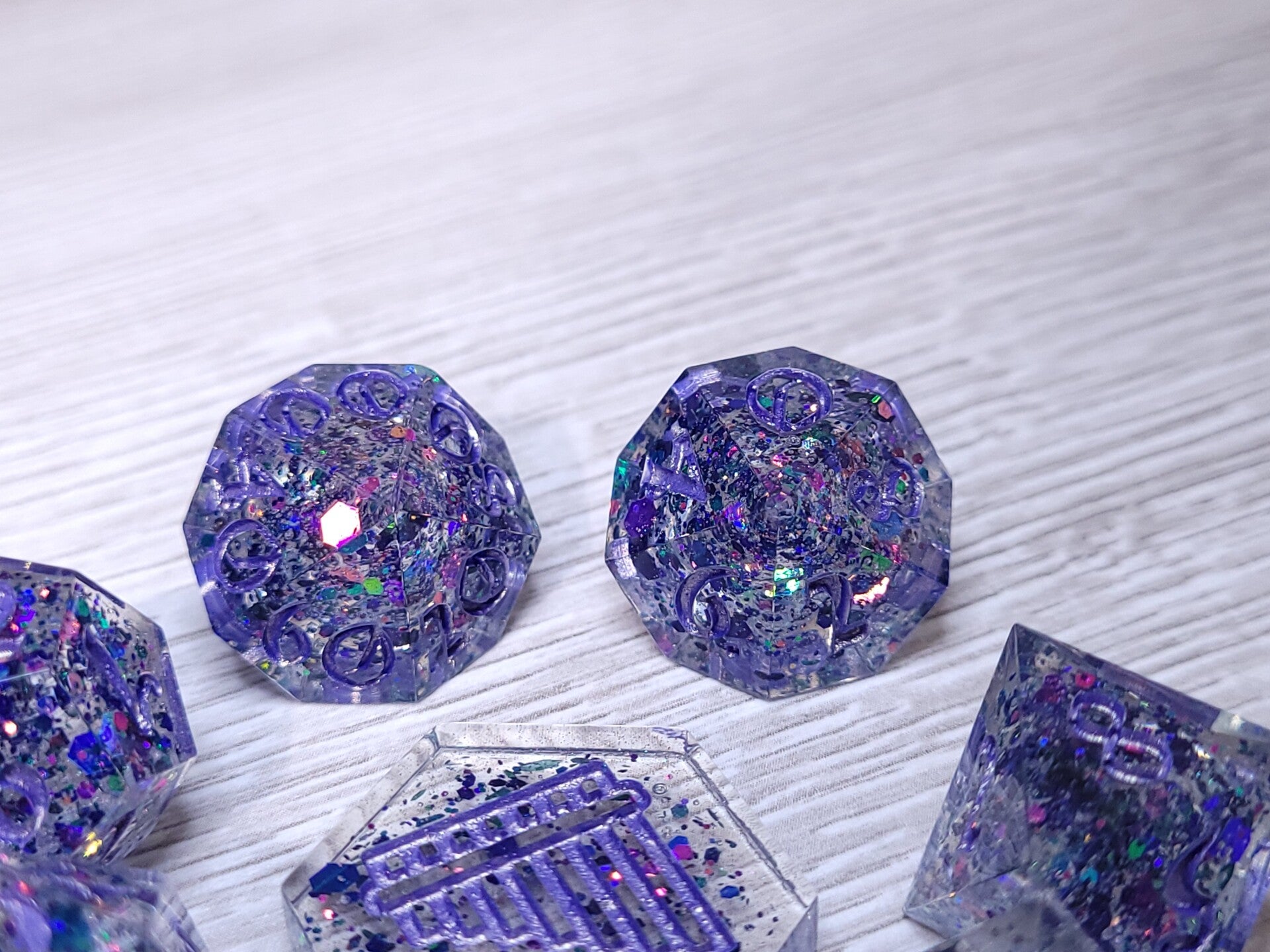 This glitter set is a color shift pink, purple, blue, teal set made with blanks that were cured outside the pressure pot so they have micro bubbles which should not affect your rolling. Inked in metallic purple.