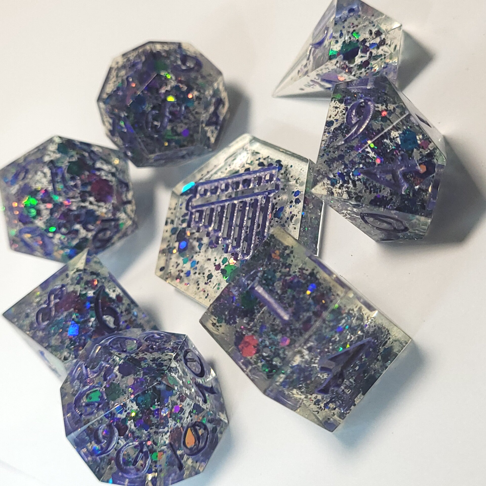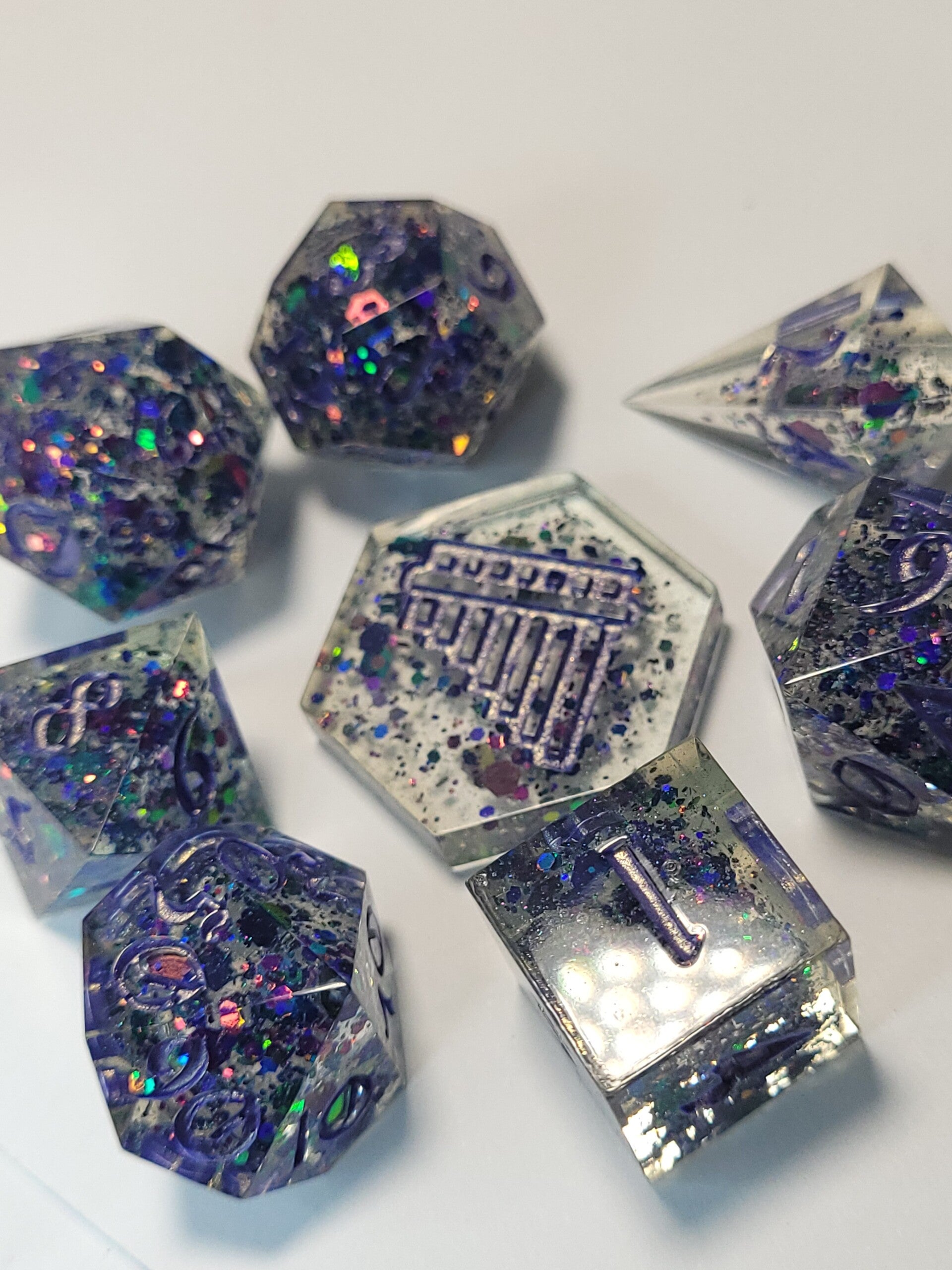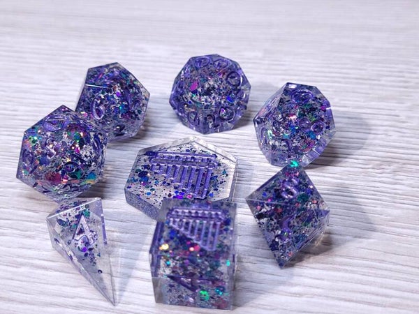 This glitter set is a color shift pink, purple, blue, teal set made with blanks that were cured outside the pressure pot so they have micro bubbles which should not affect your rolling. Inked in metallic purple.