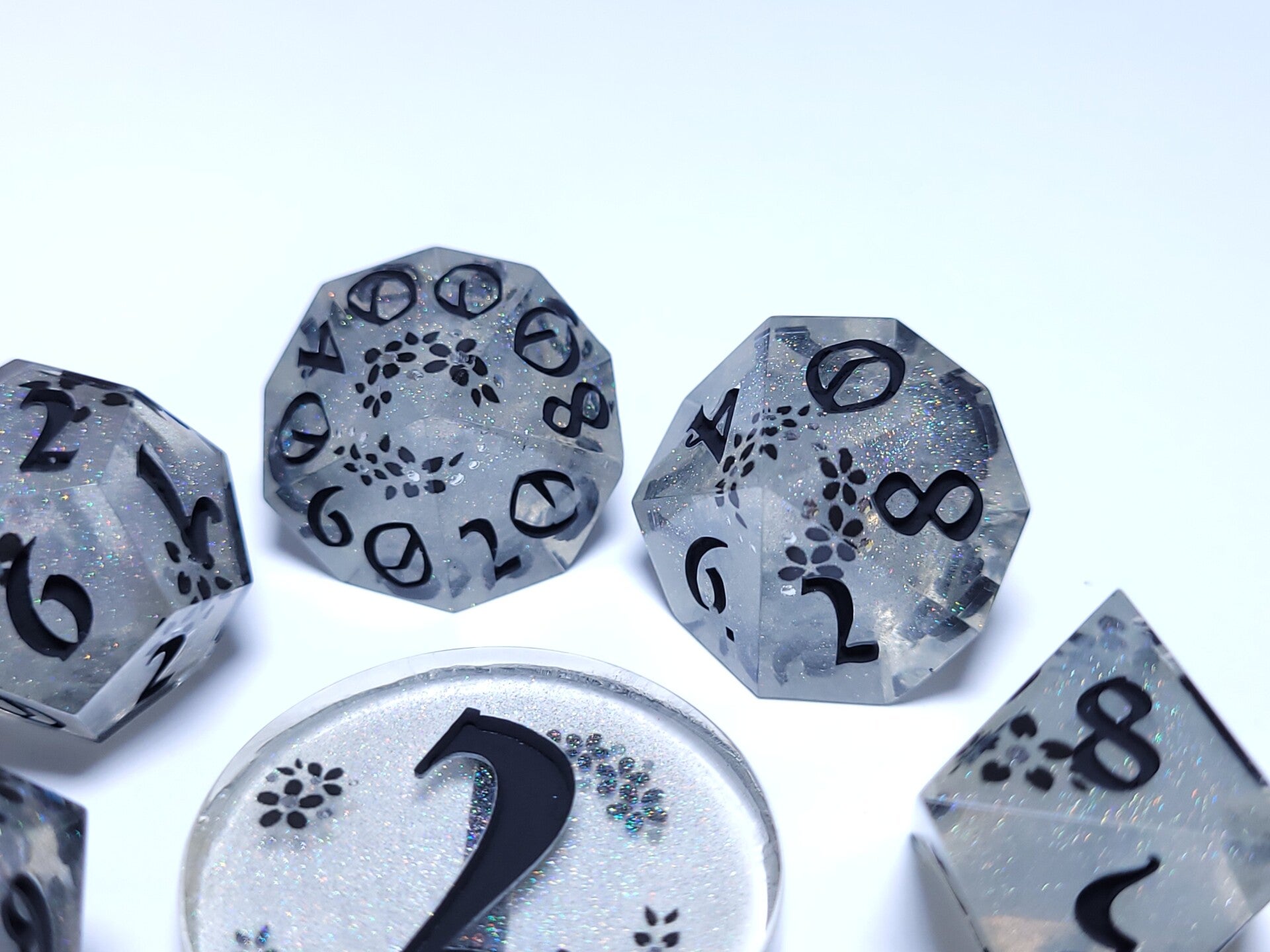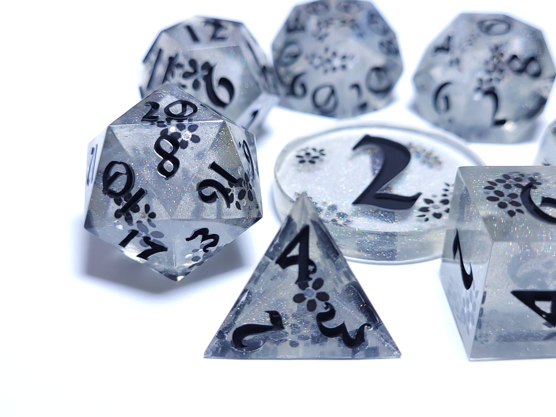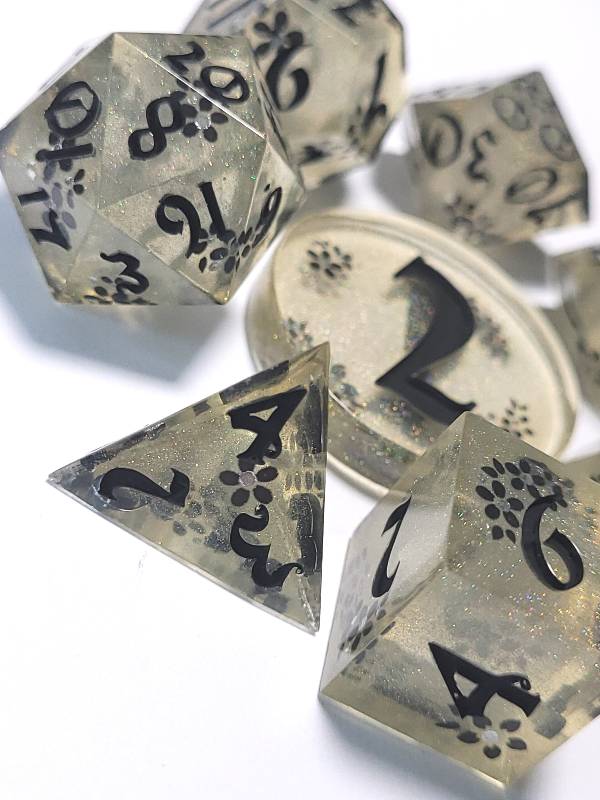 This set is a clear resin with micro fine holo glitter blank with black flower stickers aplied and recast with a clear shell. Inked in a matte black.