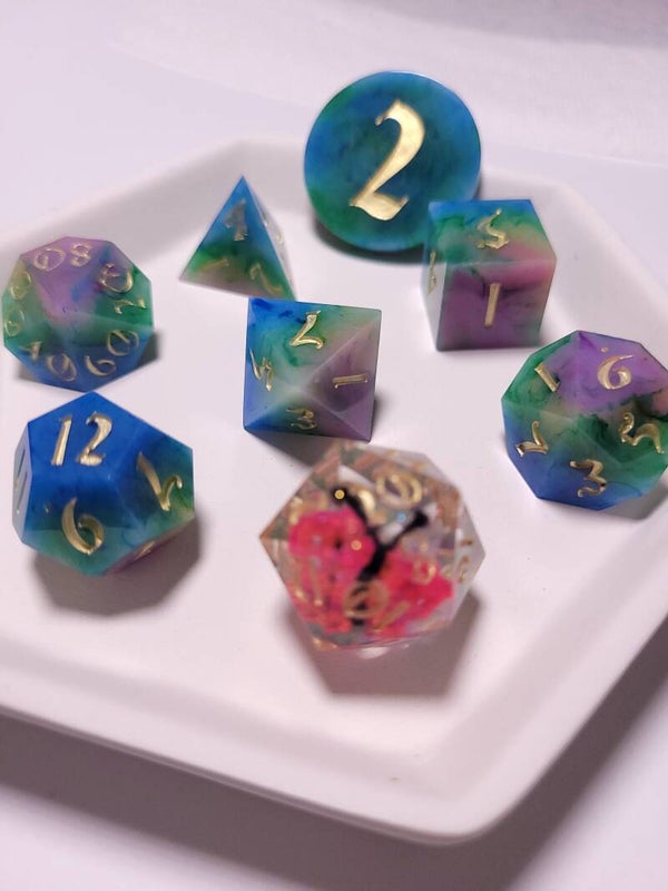 This set was a trial for my Mirabell inspired set. A hand tatted butterfly rests in the d20 with a multicolored pour for the rest of the dice. The blue and green settled on the high faces and the low faces have more color variation. Inked in gold. This set has no major flaws.