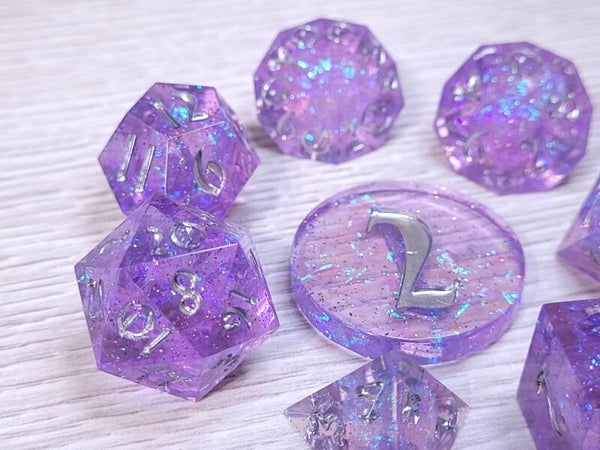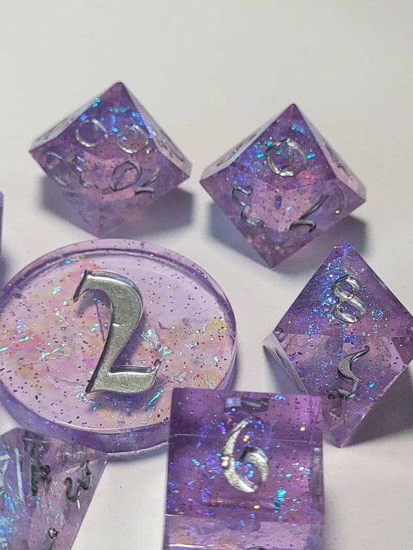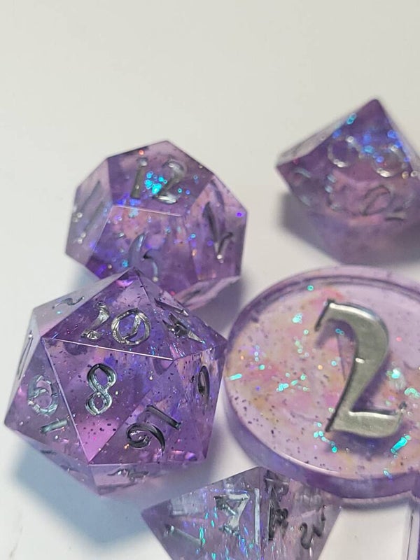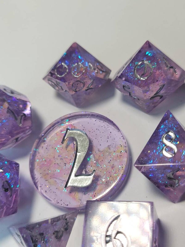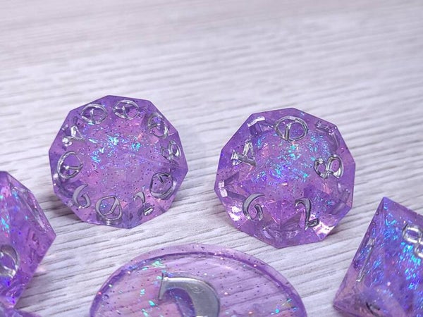 This set is a purple base with an iridescent mylar inside. Inked in chrome.