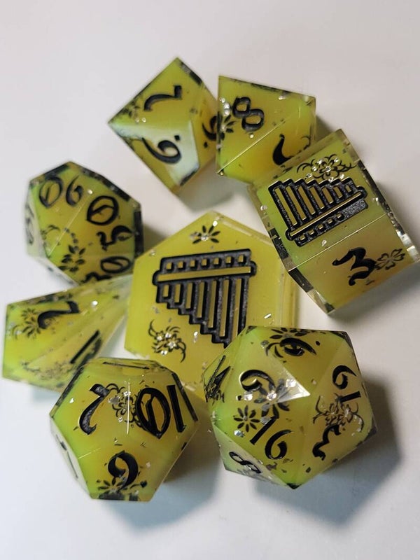 This set has a nice sunshine yellow blank wraped in black and silver floral stickers and silver flakes in the clear shell. Inked in your choice of color.