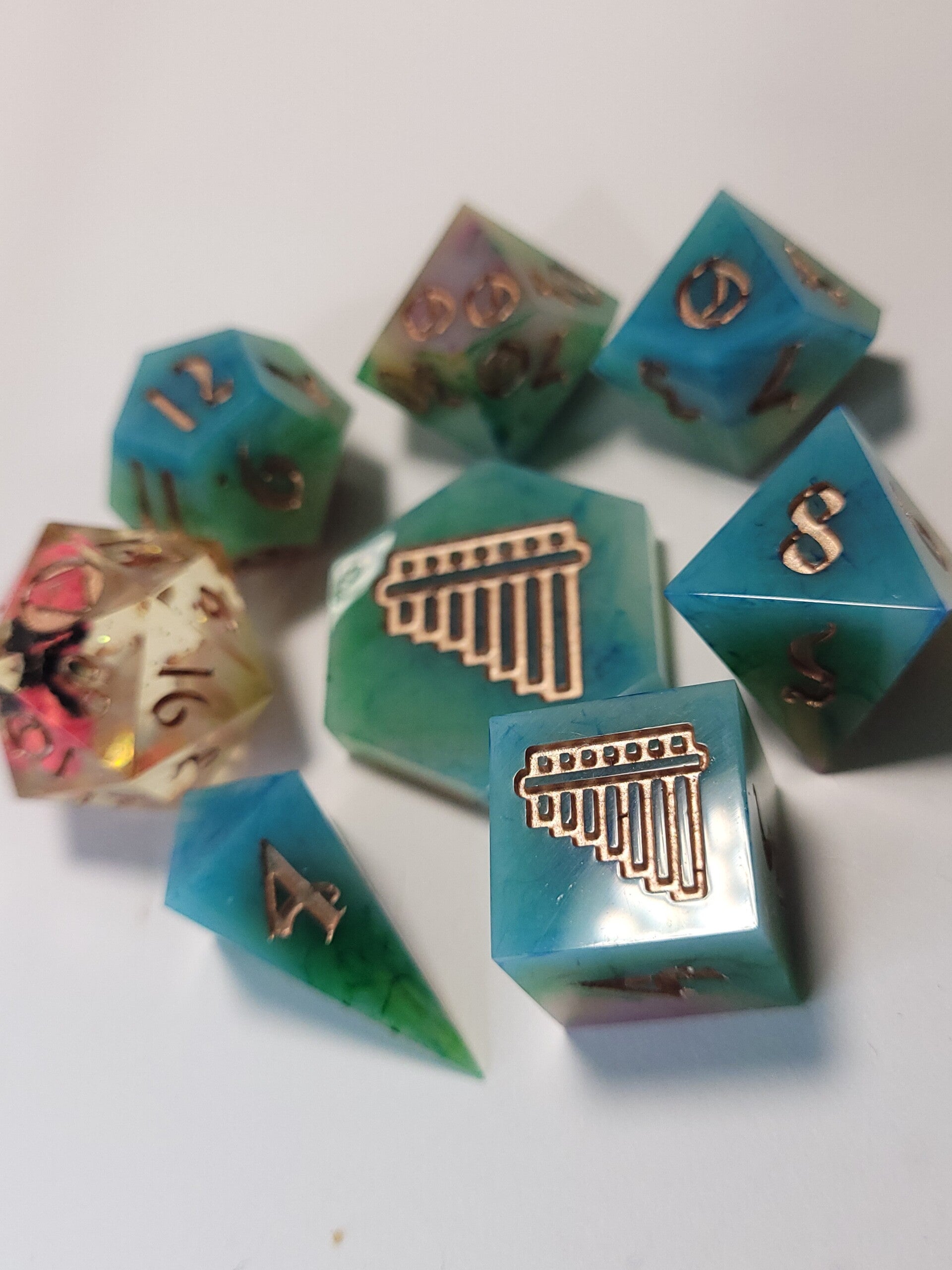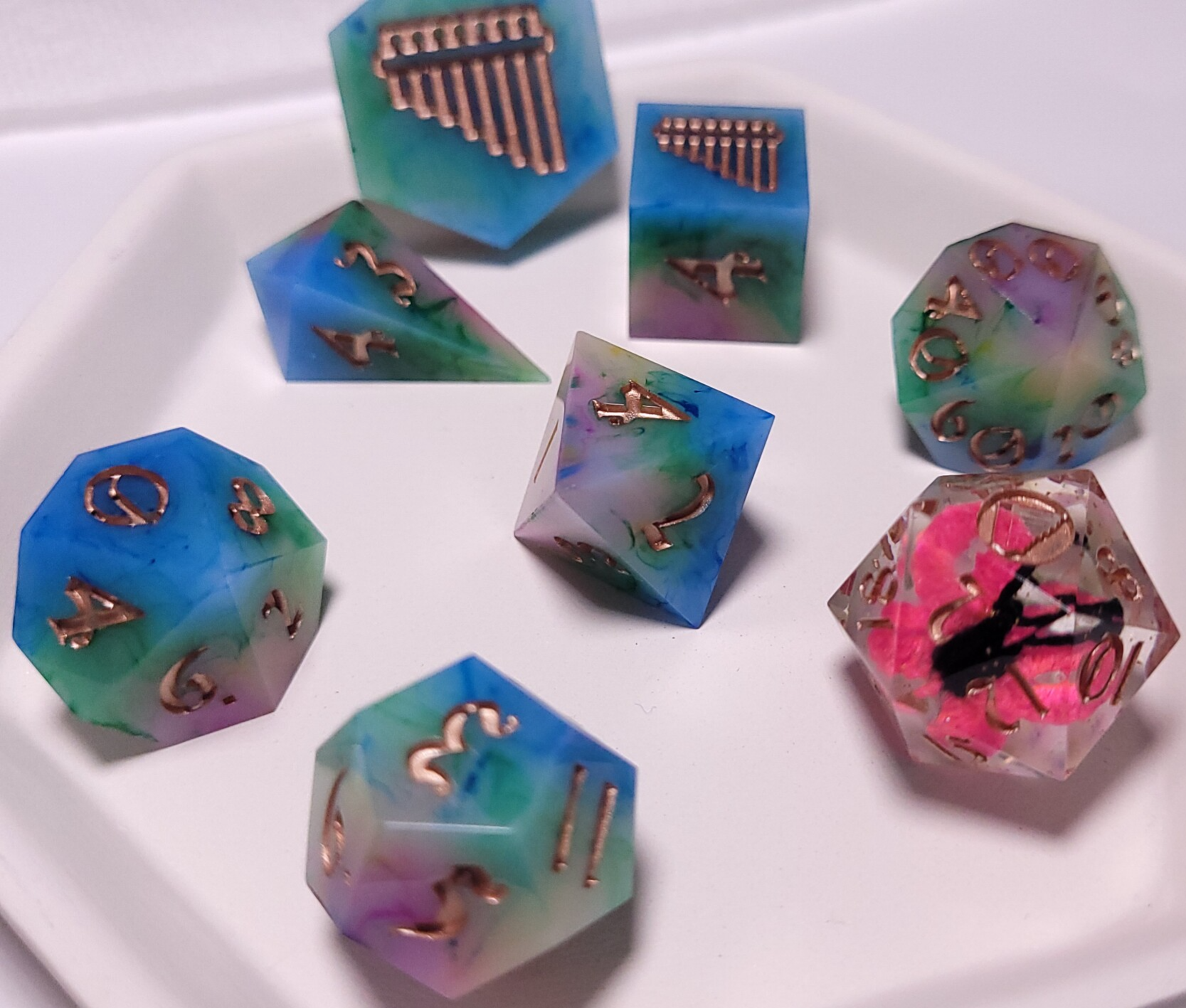 This set was a trial for my Mirabell inspired set. A hand tatted butterfly rests in the d20 with a multicolored pour for the rest of the dice. The blue and green settled on the high faces and the low faces have more color variation. Inked in rose gold.