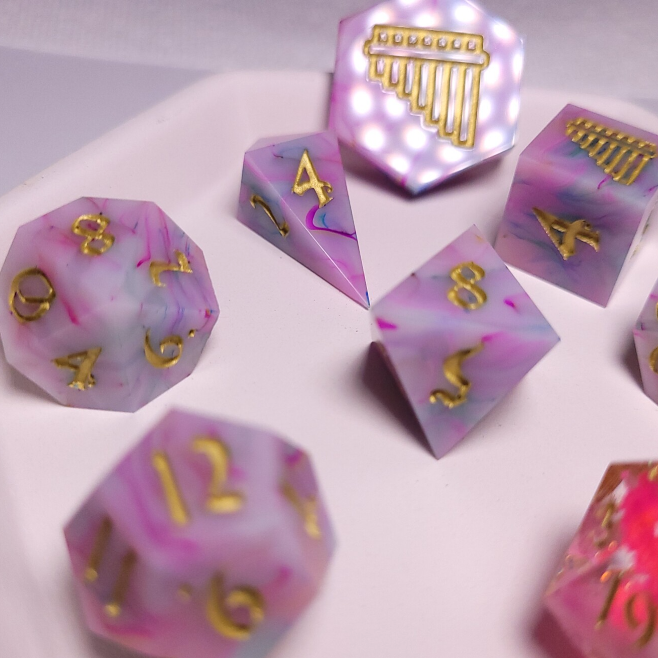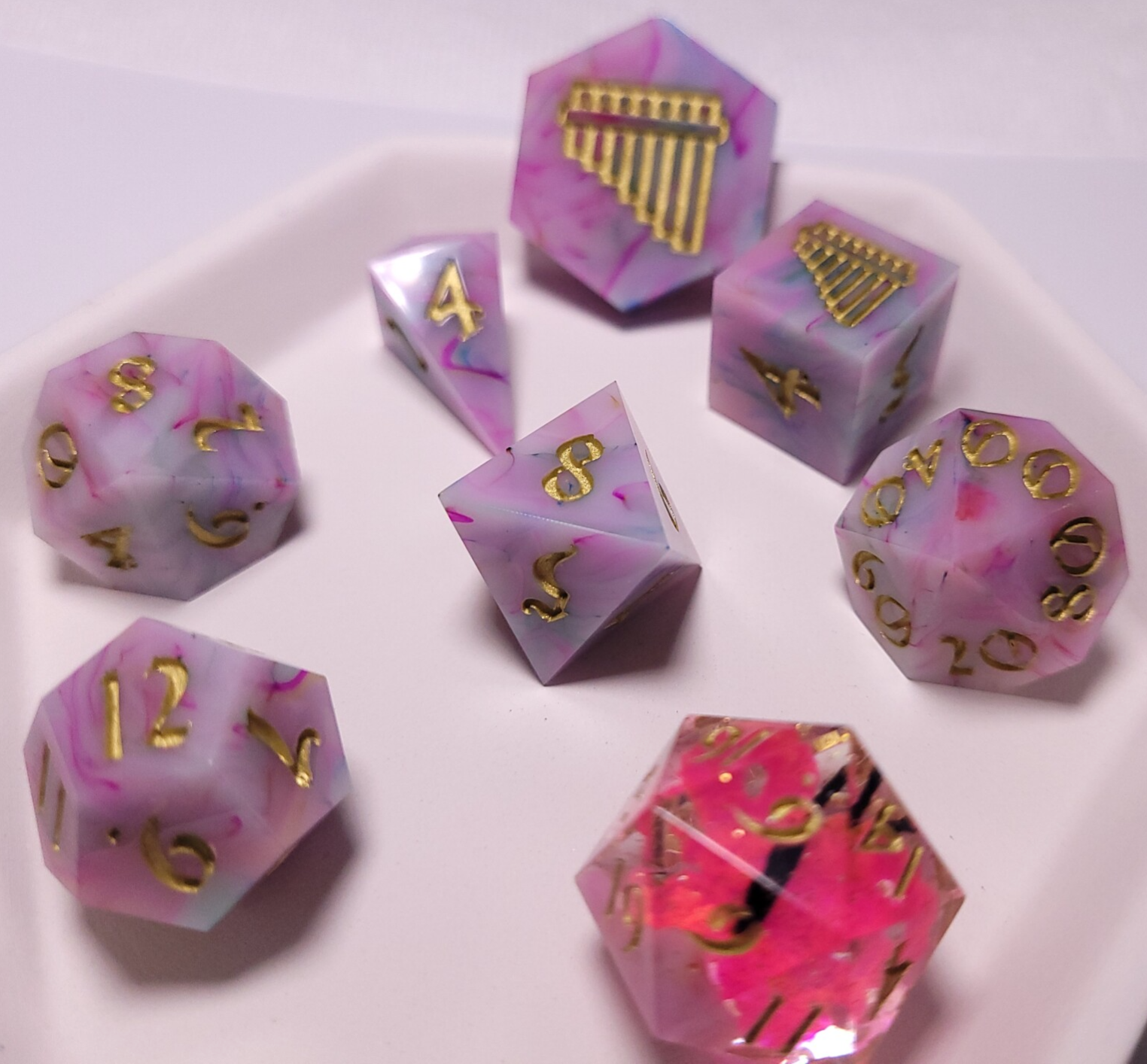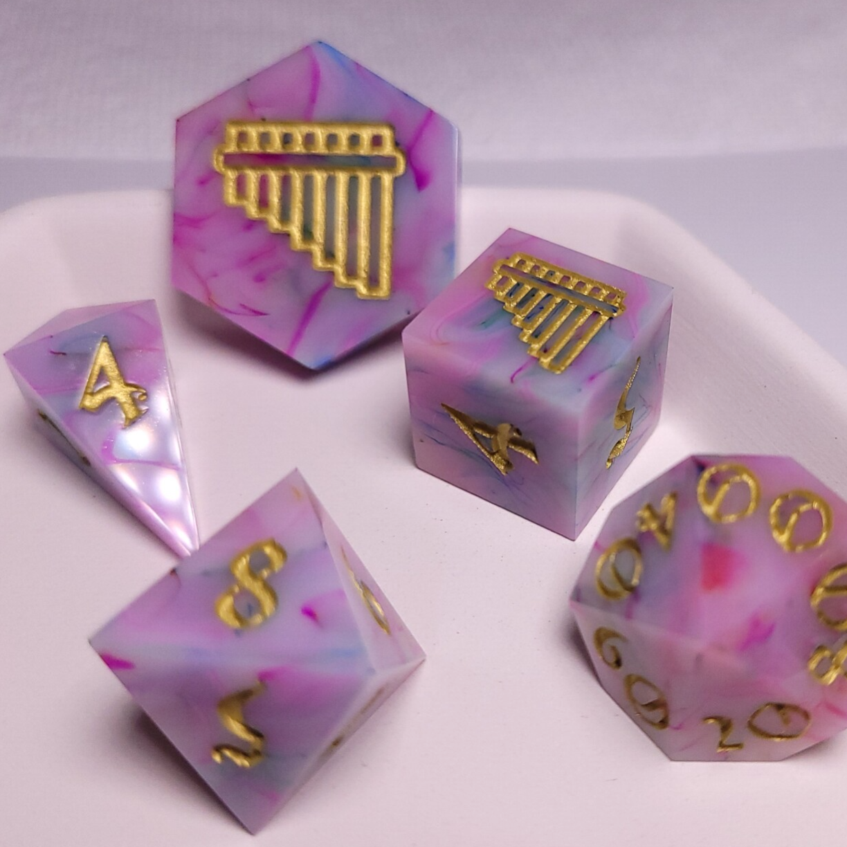 This set turned out just how I wanted the set for Mirabelle to turn out! Swirls of color intertwine in this beautiful set with a tatted butterfly in the d20. Inked in a dark gold.