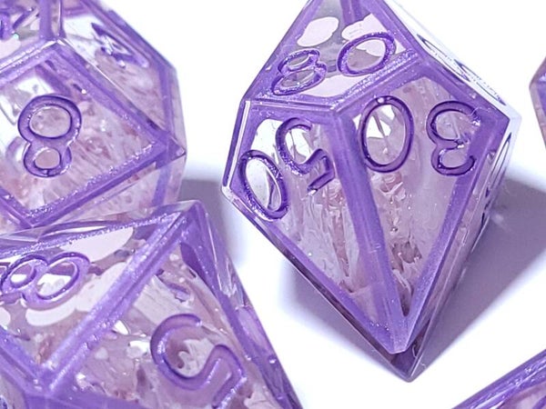 A very pale pink petri edged in purple with an iridescent sparkle. Inked in metallic purple.