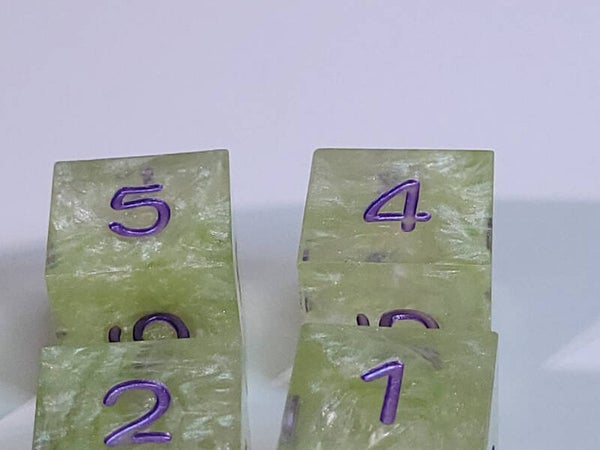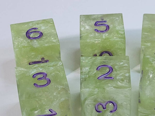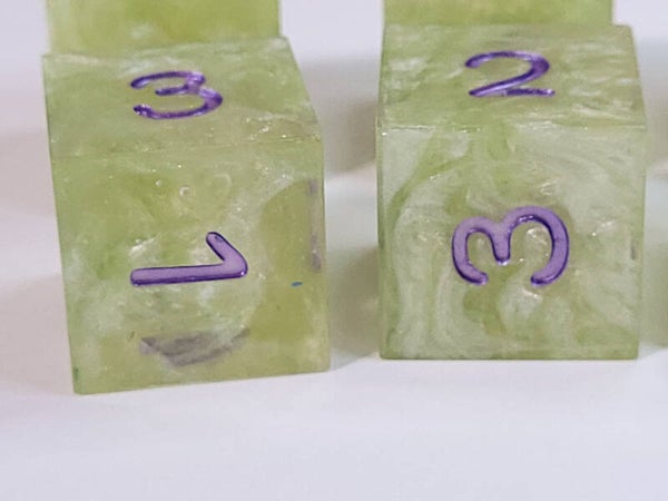 This set of 20mm D6's are a swirl of pale green mica resin and clear resin. Inked in a pale purple metallic.