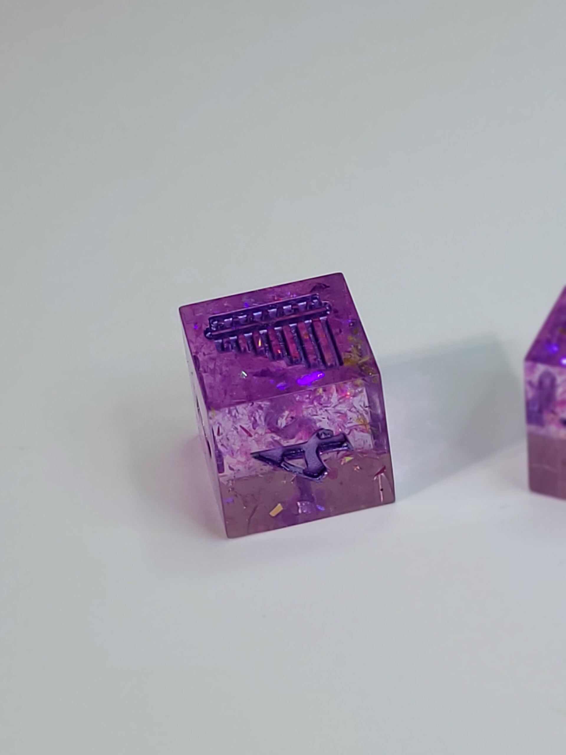 These are a pale purple resin with a purple iridescent flake. Inked in purple metallic.