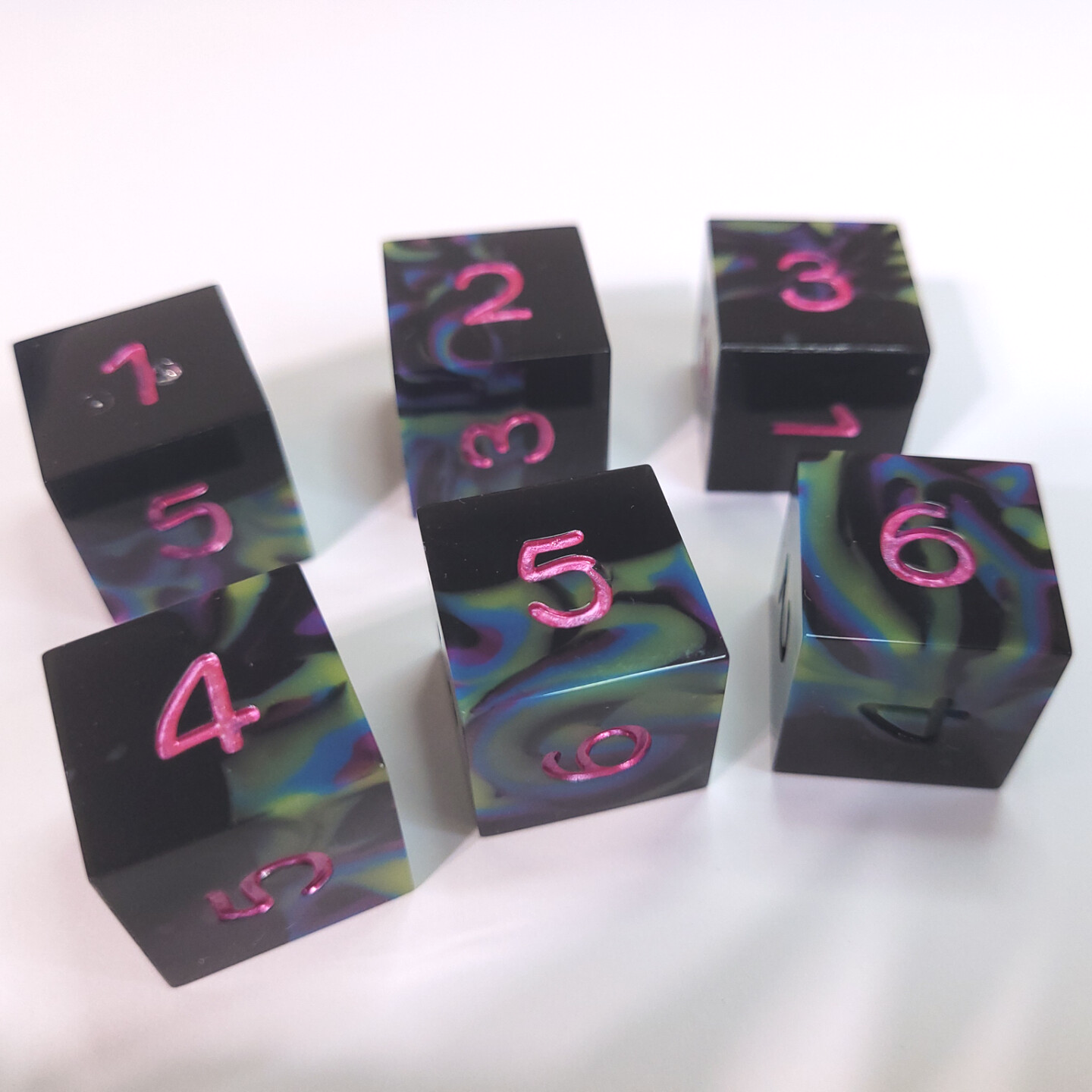 A half black and half swirled dirtypour. Inked in pink metallic.