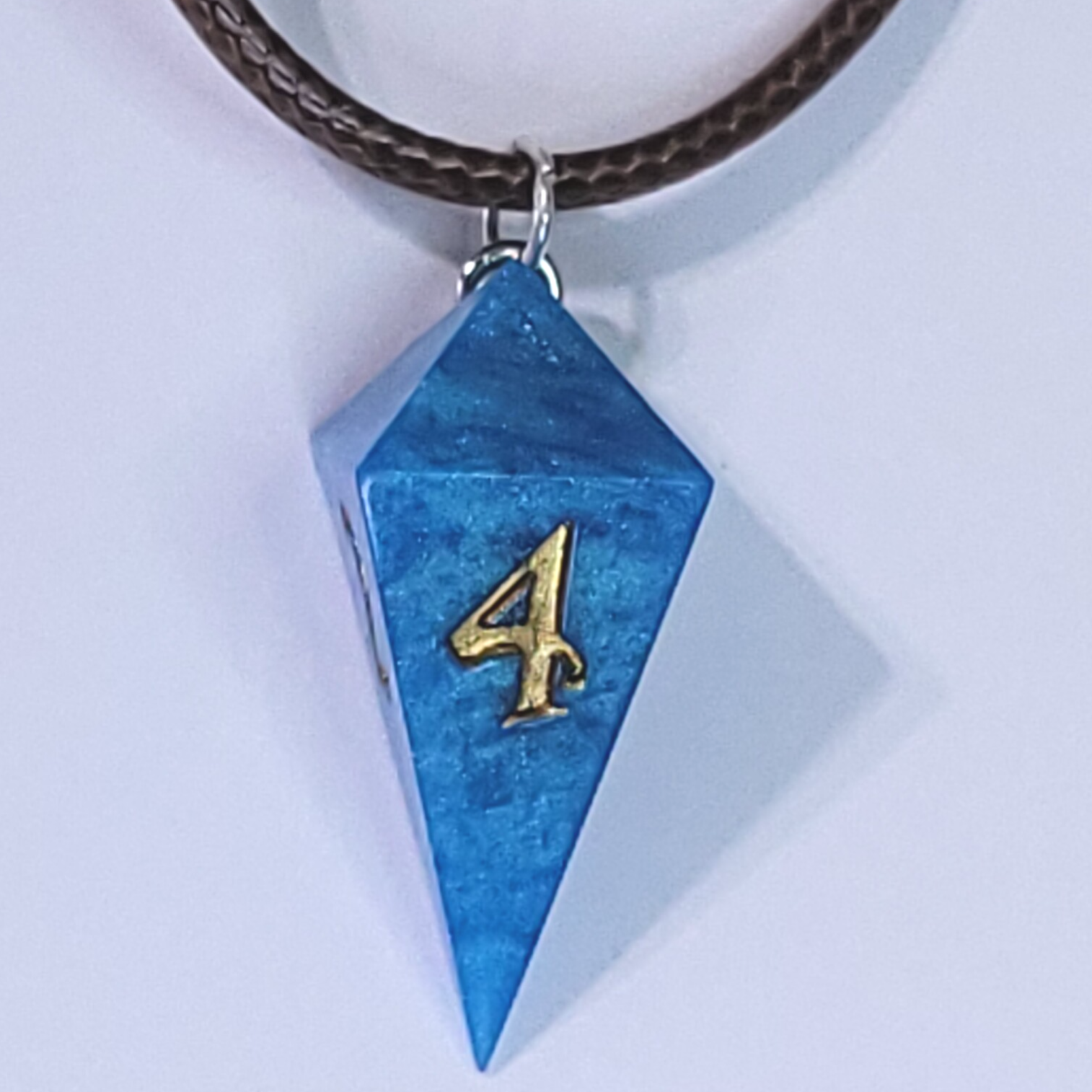 These necklaces are small (1.25 inch, 3cm) Shard d4s a Dark teal color shifting mica that changes to blue with heat inked in a deep gold.