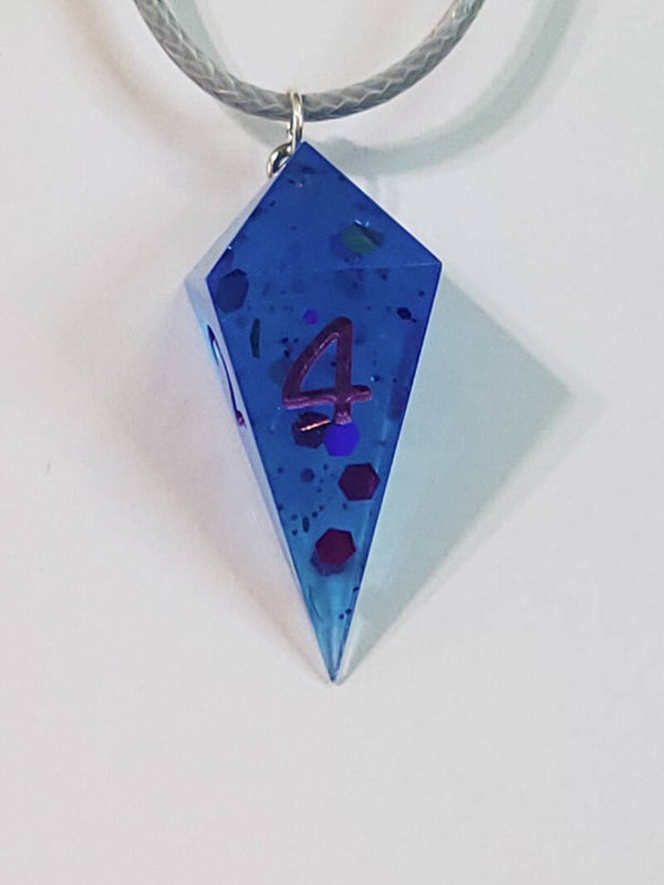 This necklace is a large (1.5 inch, 4cm) Shard d4 made of blue resin with a color shifting glitter. Inked in purple to blue color shift.