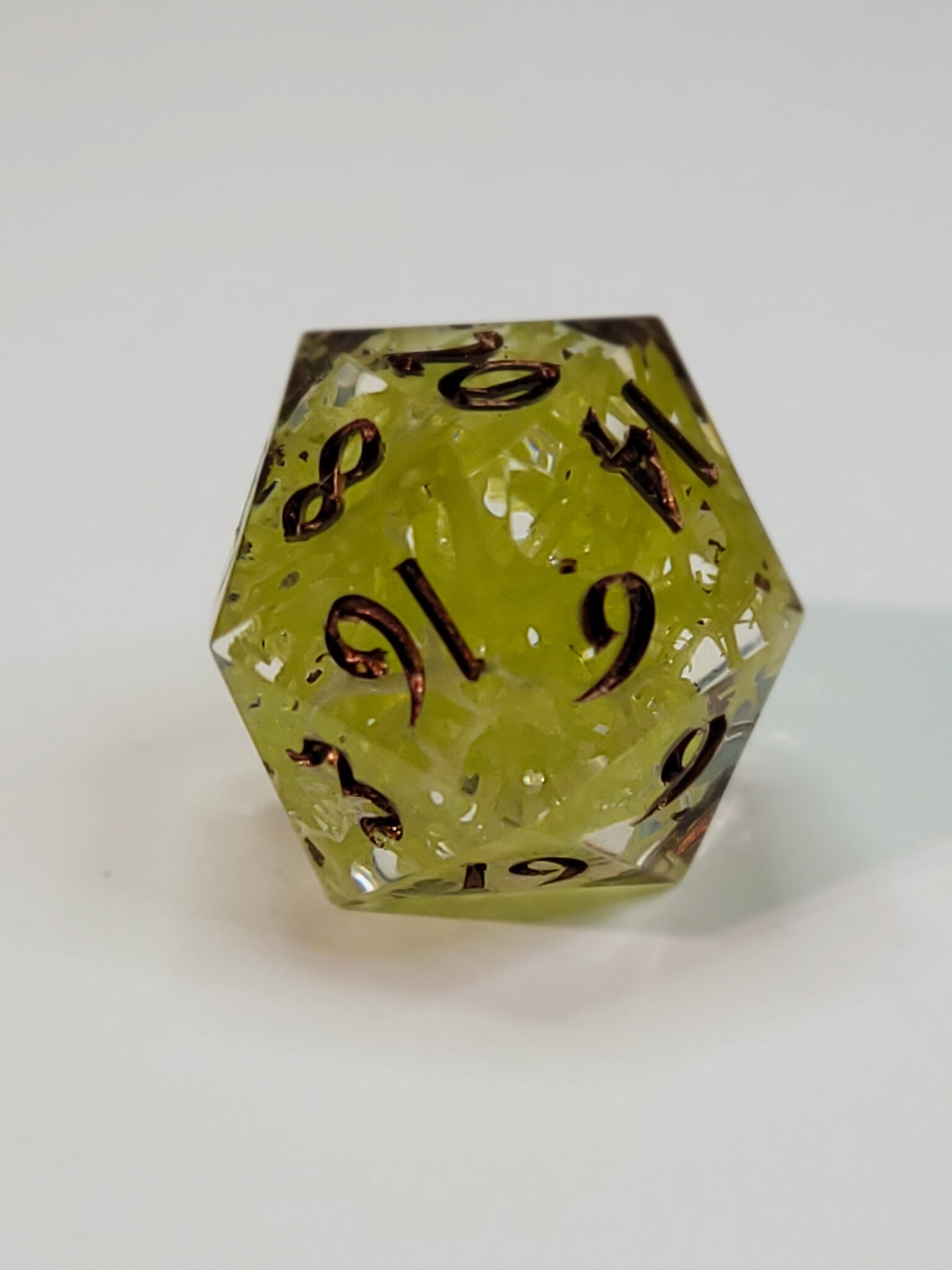 This is a Normal sized D20. A D20 with moss in clear. Inked in dark copper.