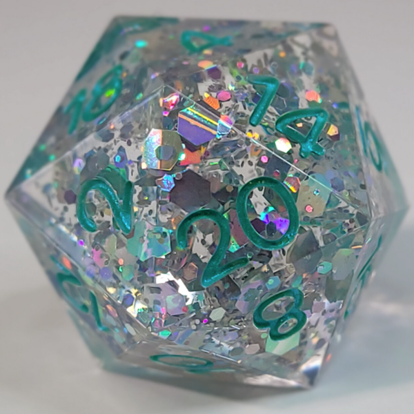 This is a 25mm D20. Clear resin with a silver holo glitter. Inked in teal/blue colorshift.