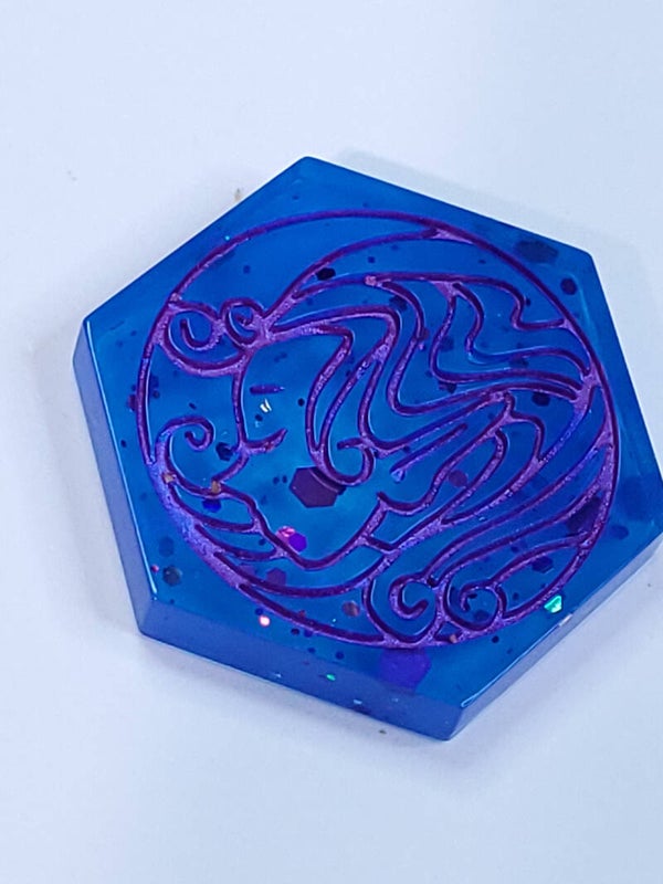 This coin is a blue resin with a color shifting glitter. Inked in purple to blue color shift.